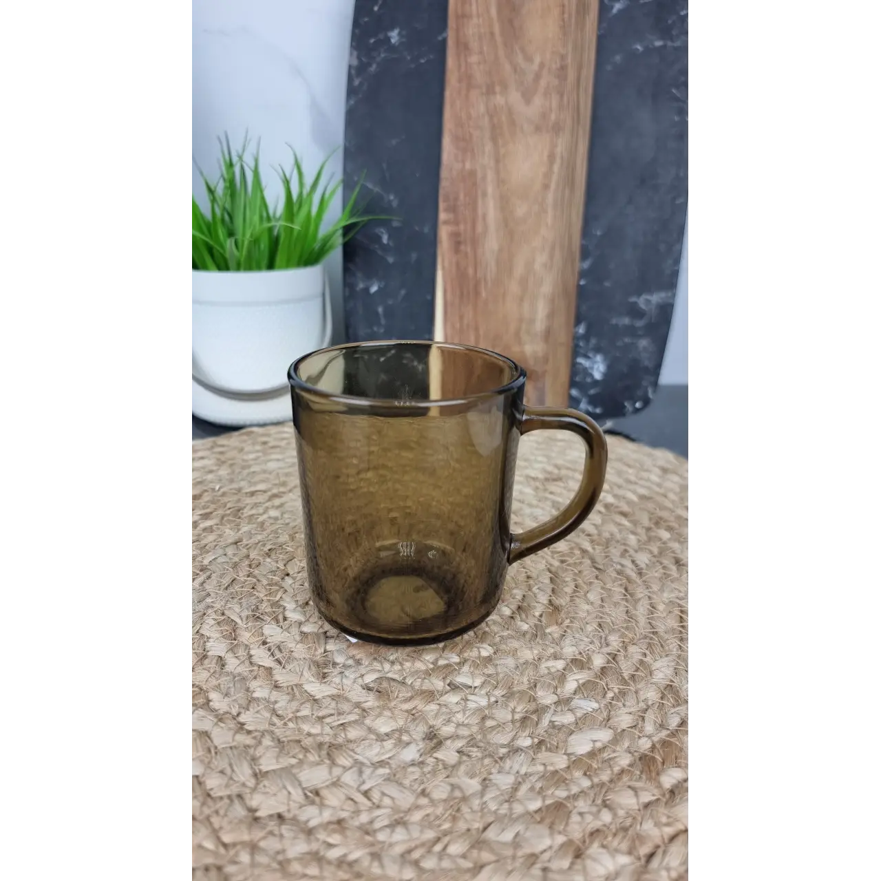 Дымчатое стекло придаёт чашке элегантный внешний вид и делает её красивым элементом сервировки стола. Удобная ручка обеспечивает комфортное использование, а качественный материал подходит для ежедневного применения. Такая чашка станет практичным выбором для дома или офиса.