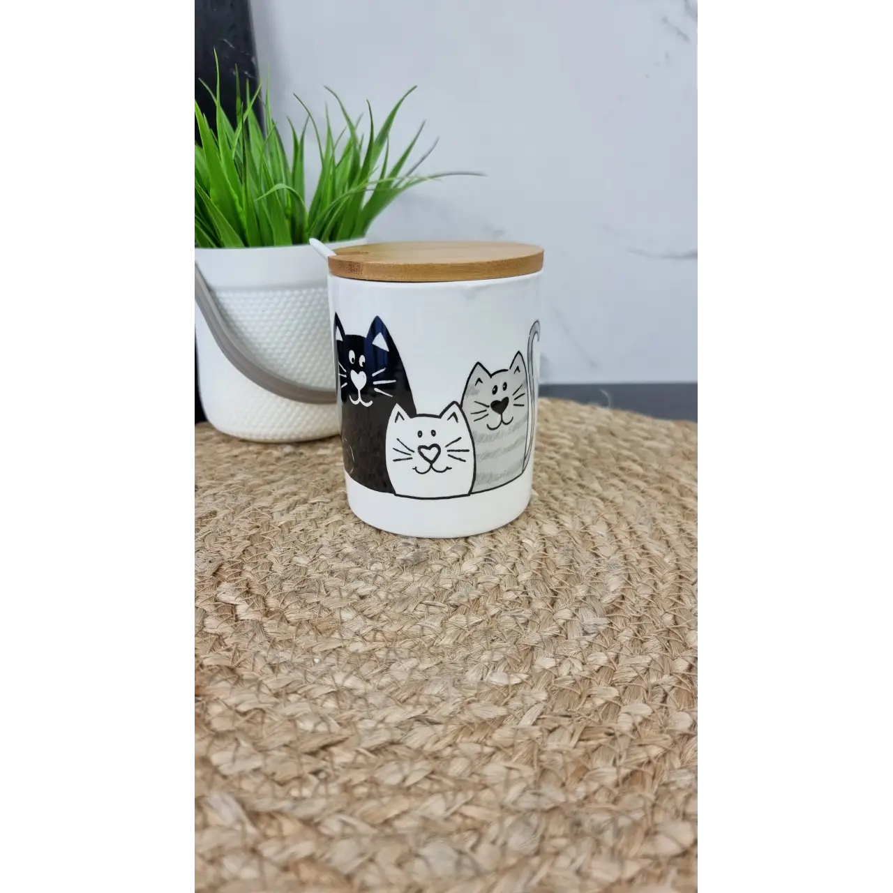 Крышка надёжно защищает содержимое от пыли и посторонних запахов, а ложка позволяет удобно набирать сахар. Декоративный дизайн с мотивом «Мурчики» придаёт изделию эстетичный вид и делает его стильным дополнением кухни.