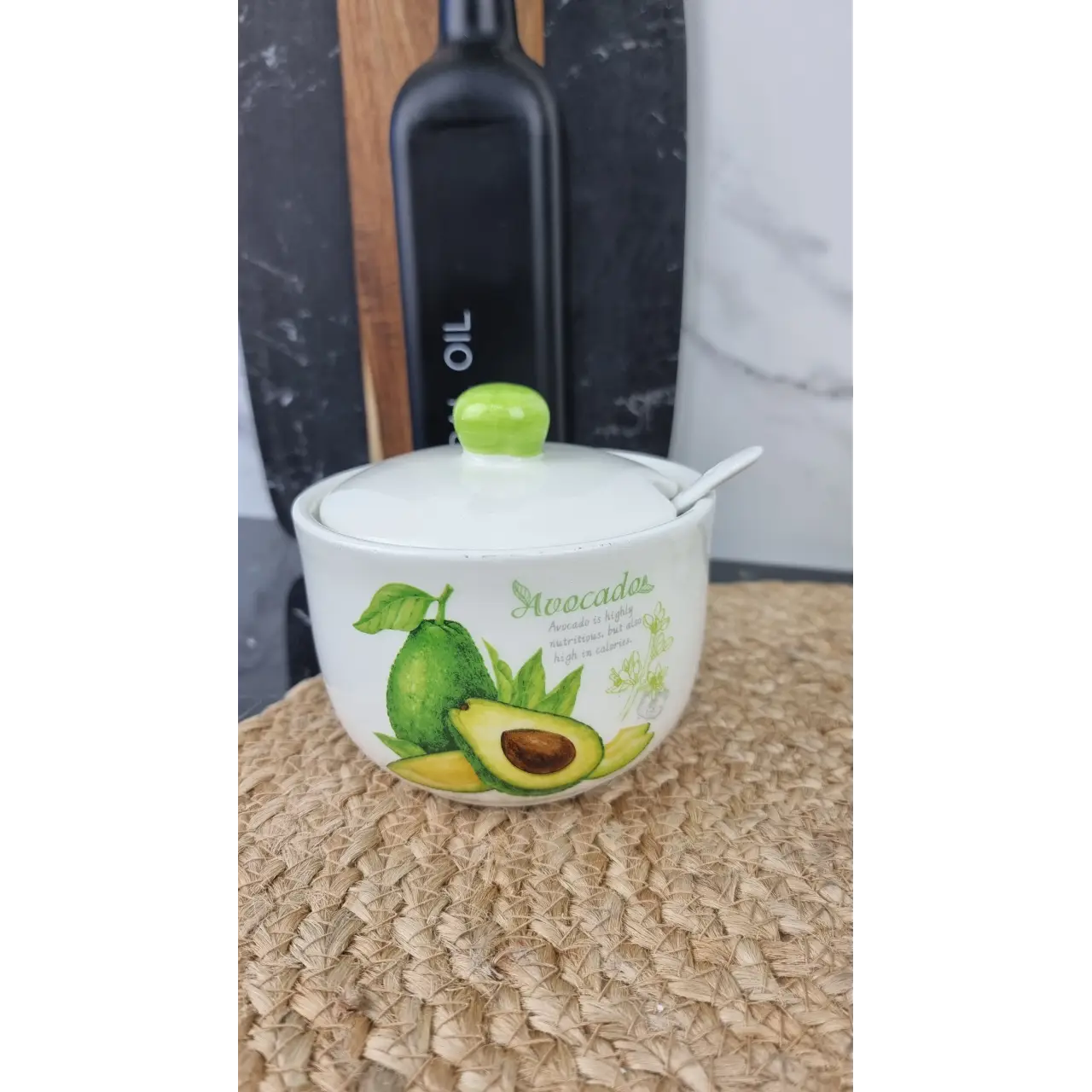 Крышка защищает содержимое от пыли и посторонних запахов, а удобная ложка позволяет легко набирать сахар. Стильный дизайн с мотивом авокадо придаёт кухне свежесть и эстетичный вид.