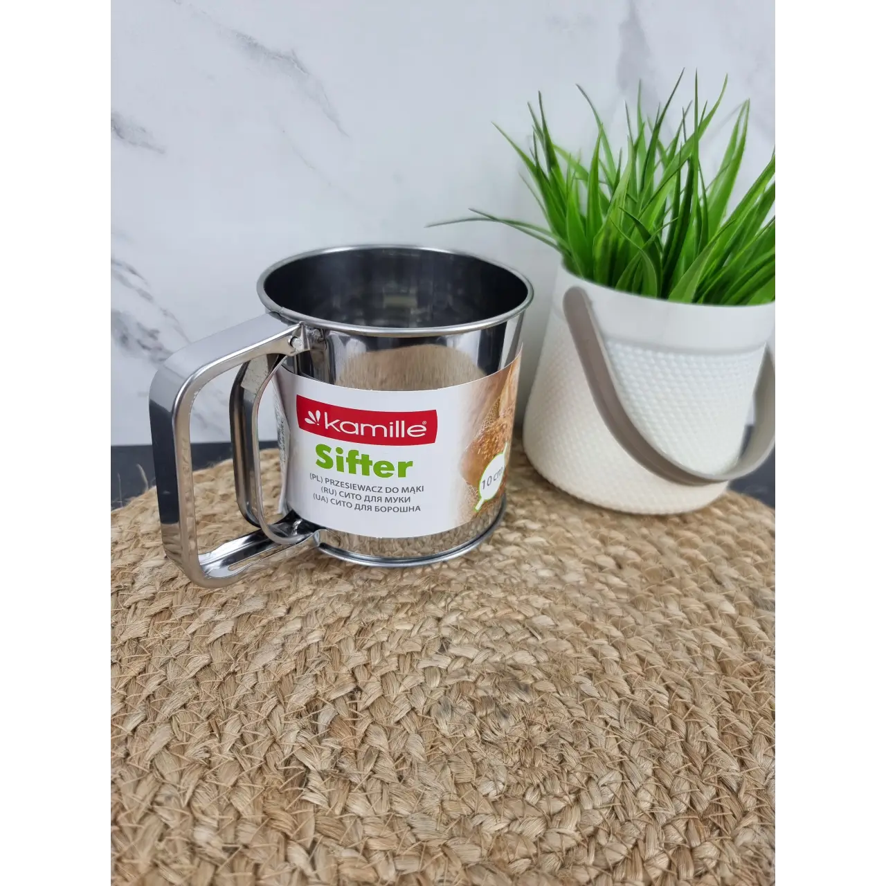 Кружка-сито Kamille — удобное приспособление для просеивания муки, сахарной пудры и других сыпучих продуктов. Изготовлена из качественной нержавеющей стали, что гарантирует надежность и длительный срок службы.
