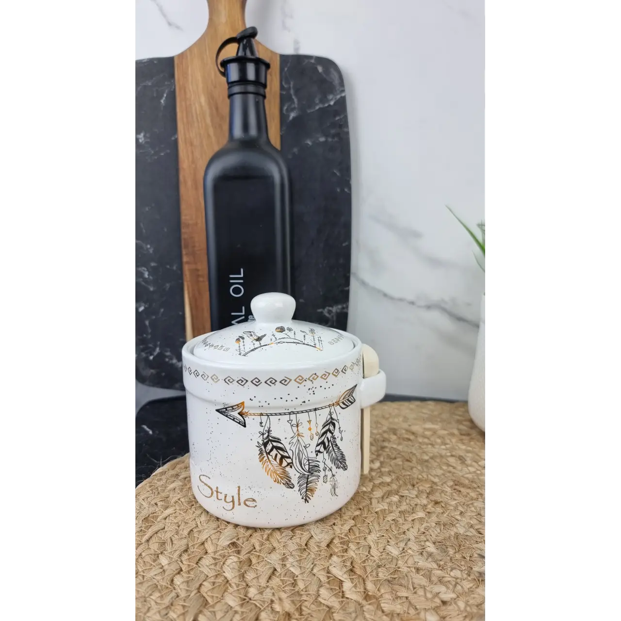 Крышка защищает содержимое от пыли и посторонних запахов, а удобная ложка позволяет легко набирать мёд. Стильный дизайн в Boho стиле придаёт изделию эстетичный вид и делает его ярким дополнением кухни.