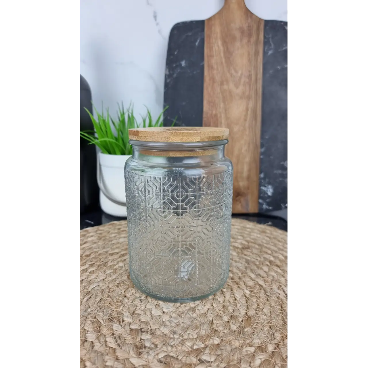 TS23018B Емкость для сыпучих стеклянная 700мл круглая рельеф бамбук крышка