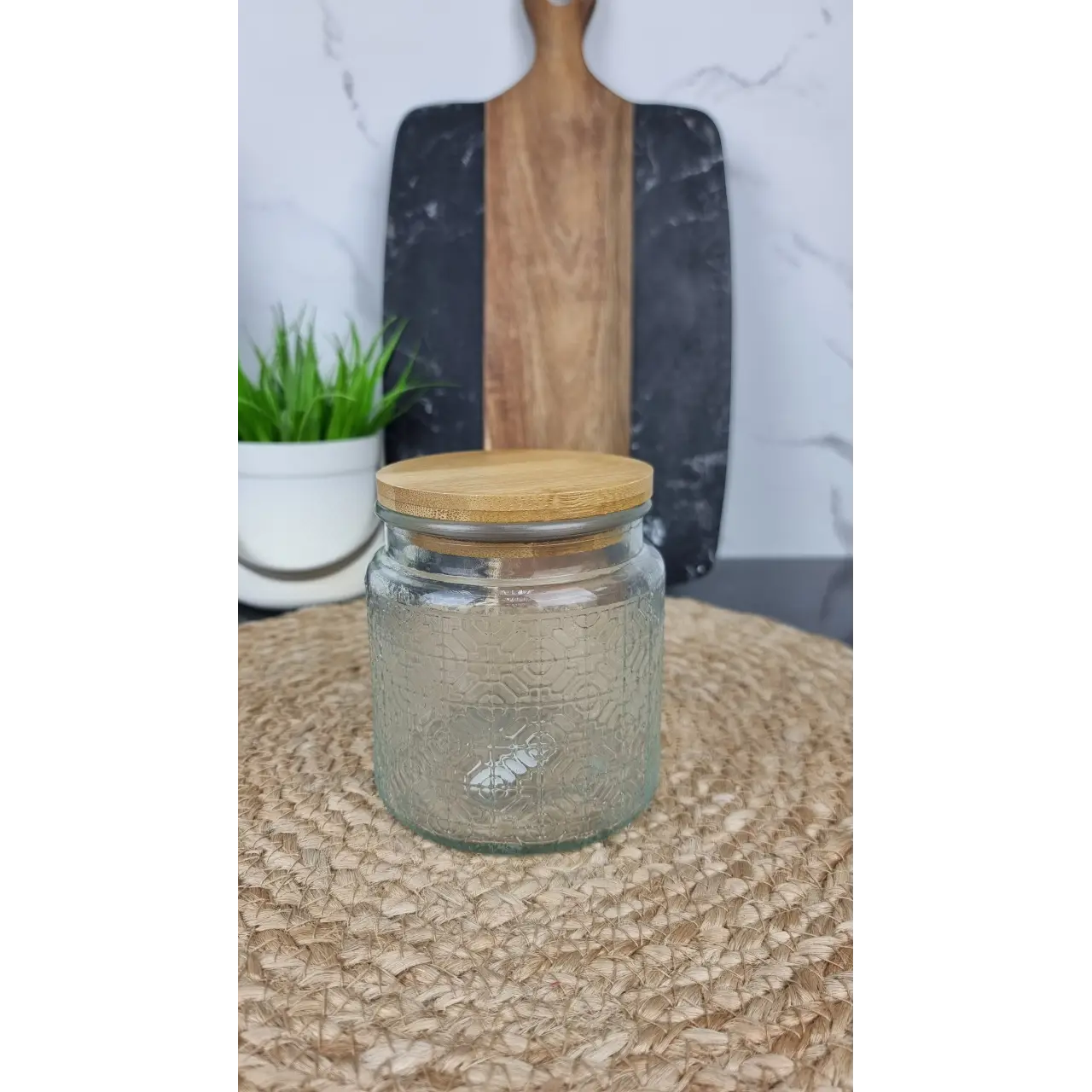 TS23018A Емкость для сыпучих стеклянная 500мл круглая рельеф бамбук крышка