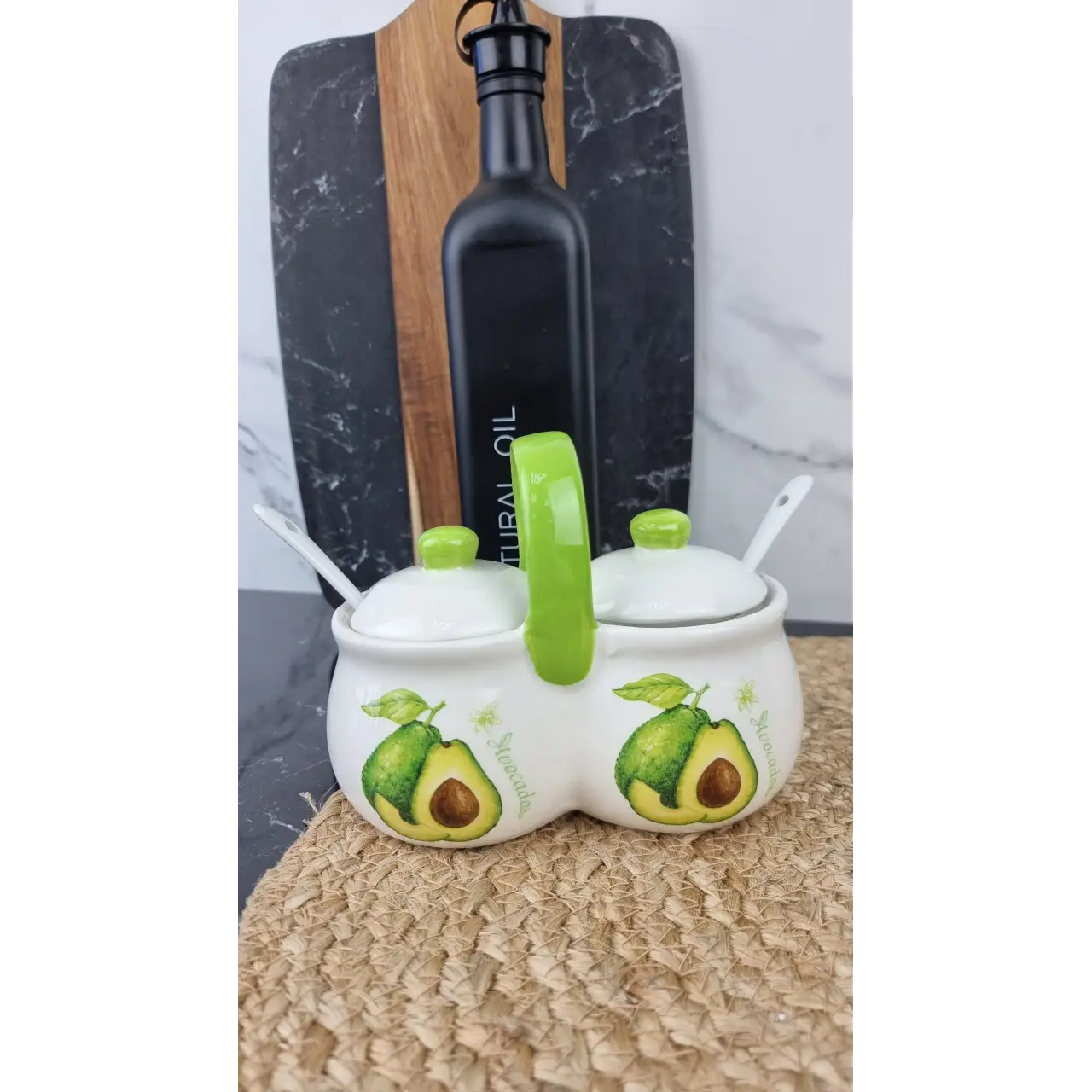Банка для специй «Авокадо» 6023-21 комплект из 2 шт., объём по 200 мл каждая, размер 15×8,5×12,5 см, изготовлена из доломита и комплектуется двумя деревянными ложками. Она предназначена для удобного хранения различных специй на кухне.