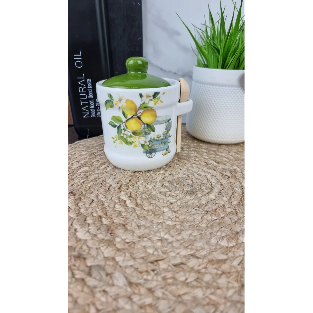 Крышка защищает содержимое от пыли и посторонних запахов, а удобная деревянная ложка позволяет легко набирать мёд. Яркий дизайн с изображением лимонов придаёт кухне свежий и стильный вид.