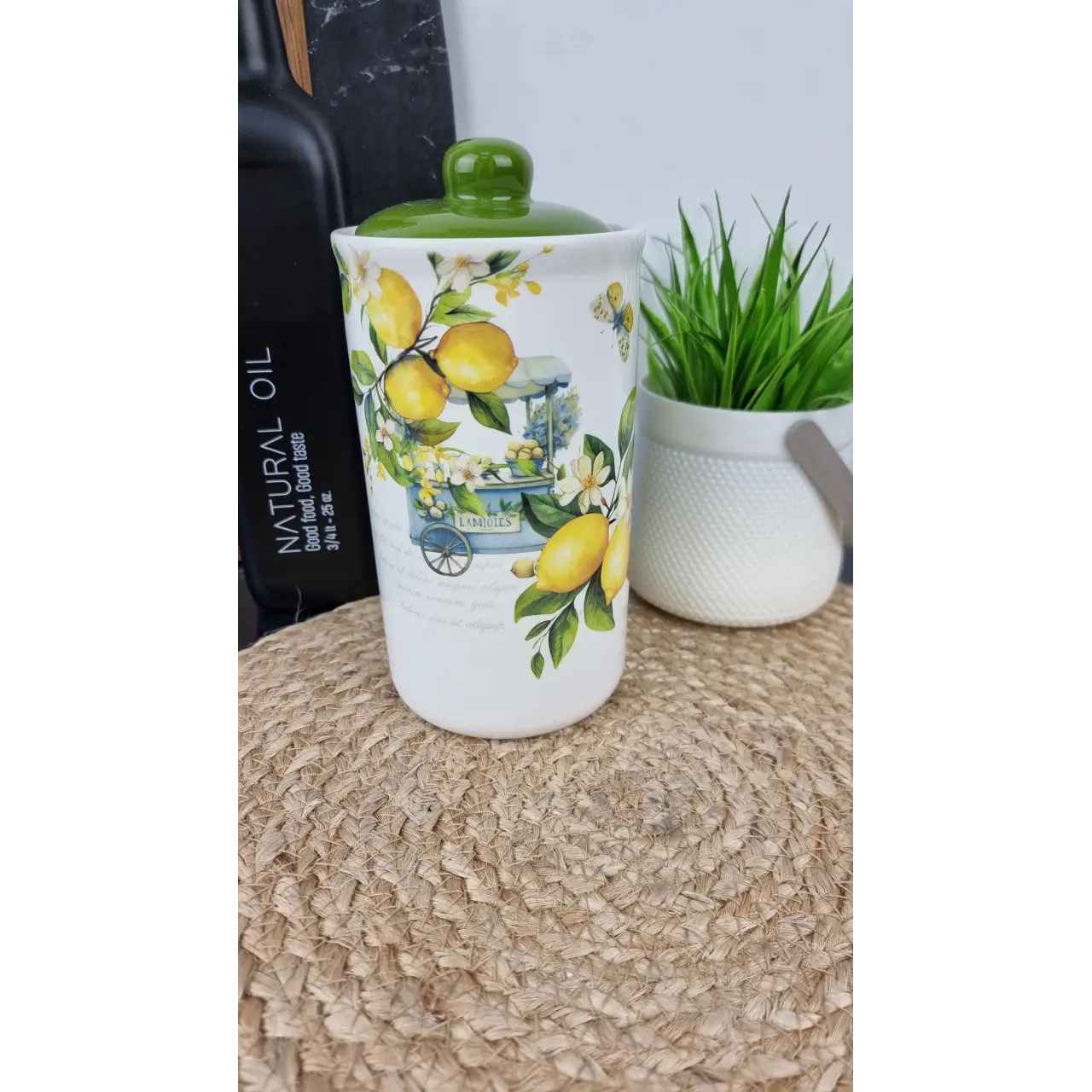 Ёмкость для сыпучих продуктов «Лимоны» 700-10-22 объёмом 850 мл изготовлена из доломита. Она предназначена для удобного хранения сахара, муки, круп, кофе или других сыпучих продуктов на кухне.