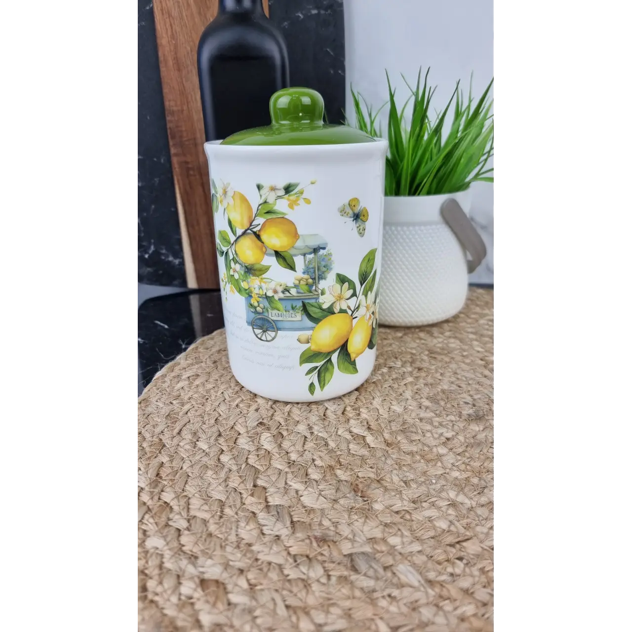 Ёмкость для сыпучих продуктов «Лимоны» 700-11-22 объёмом 700 мл изготовлена из доломита. Она предназначена для удобного хранения сахара, муки, круп, кофе или других сыпучих продуктов на кухне.