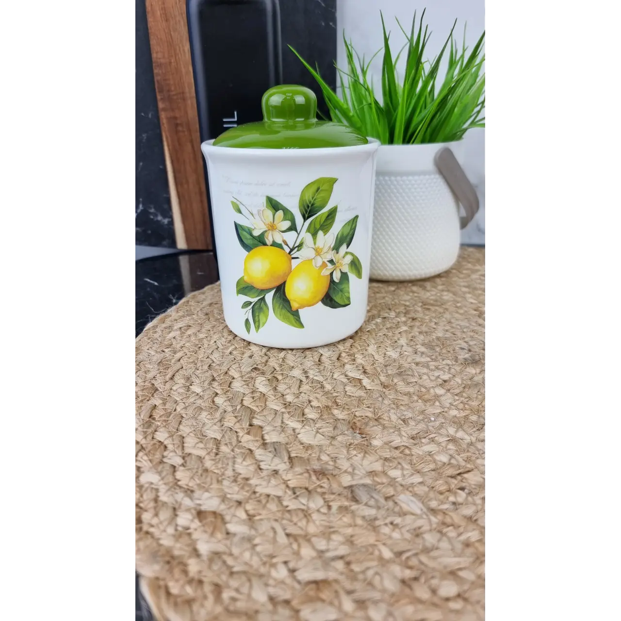 Ёмкость для сыпучих продуктов «Лимоны» 700-12-22 объёмом 500 мл изготовлена из доломита. Она предназначена для удобного хранения сахара, муки, круп, кофе или других сыпучих продуктов на кухне.