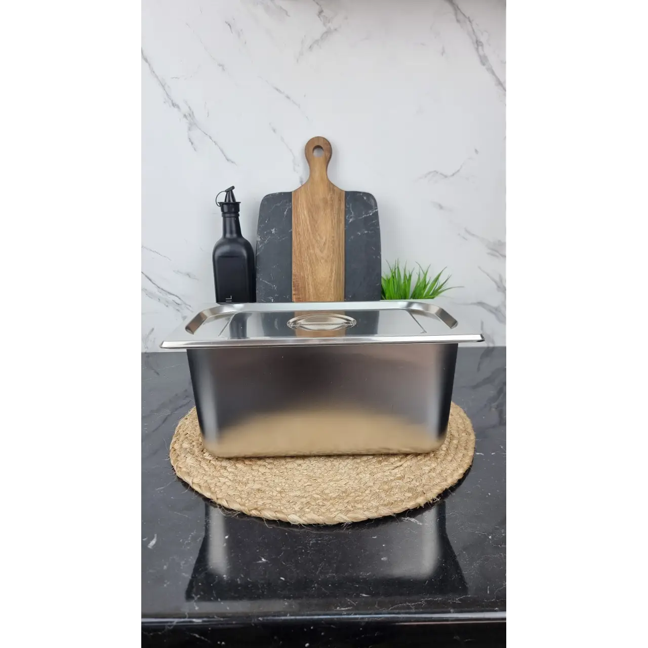 Гастрономическая ёмкость BN-1062 размером 33×18×15 см с крышкой – практичная и надёжная посуда из нержавеющей стали, предназначенная для хранения, приготовления и транспортировки продуктов. Благодаря прочному материалу ёмкость устойчива к коррозии, легко очищается и имеет длительный срок службы. Крышка плотно закрывает ёмкость, помогая сохранять свежесть продуктов. Подходит для использования на профессиональной кухне, в ресторанах, кафе и дома.