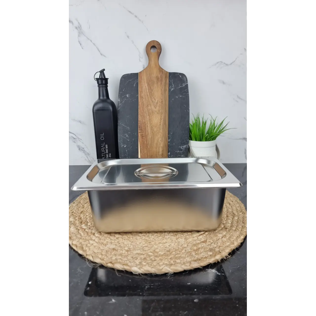 Гастрономическая ёмкость BN-1066 размером 27×17×10 см с крышкой – практичная и надёжная посуда из нержавеющей стали, предназначенная для хранения, приготовления и транспортировки продуктов. Благодаря прочному материалу ёмкость устойчива к коррозии, не впитывает запахи и легко очищается. Крышка плотно закрывает ёмкость, помогая сохранять свежесть продуктов. Подходит для использования на профессиональной кухне, в кафе, ресторанах и дома.