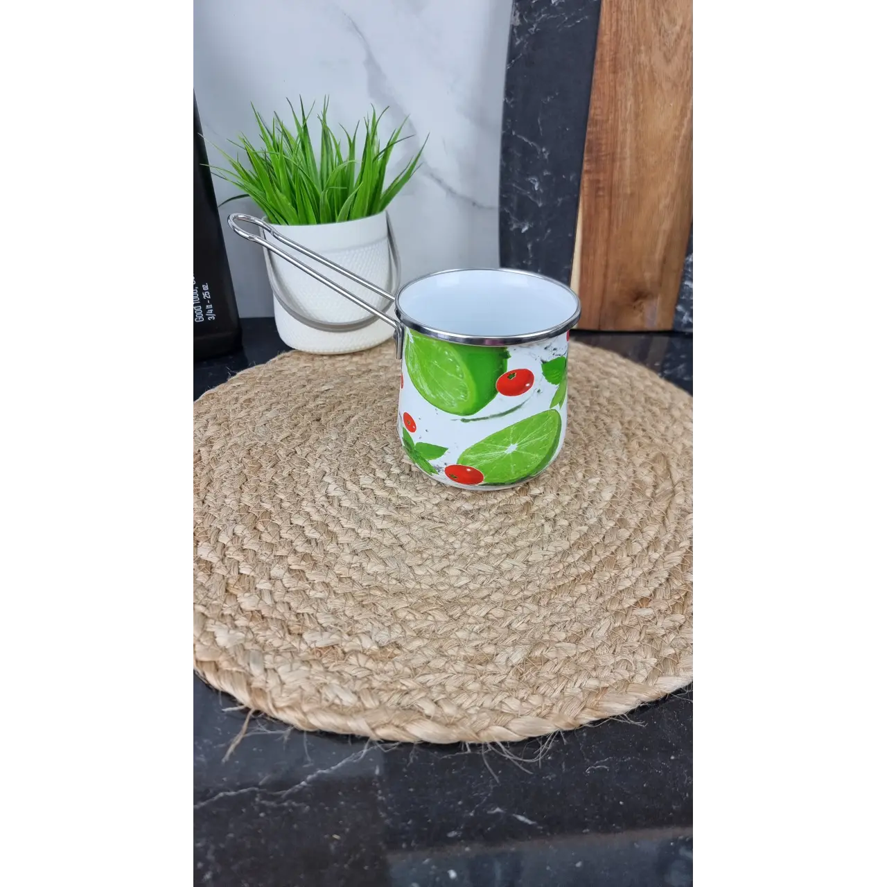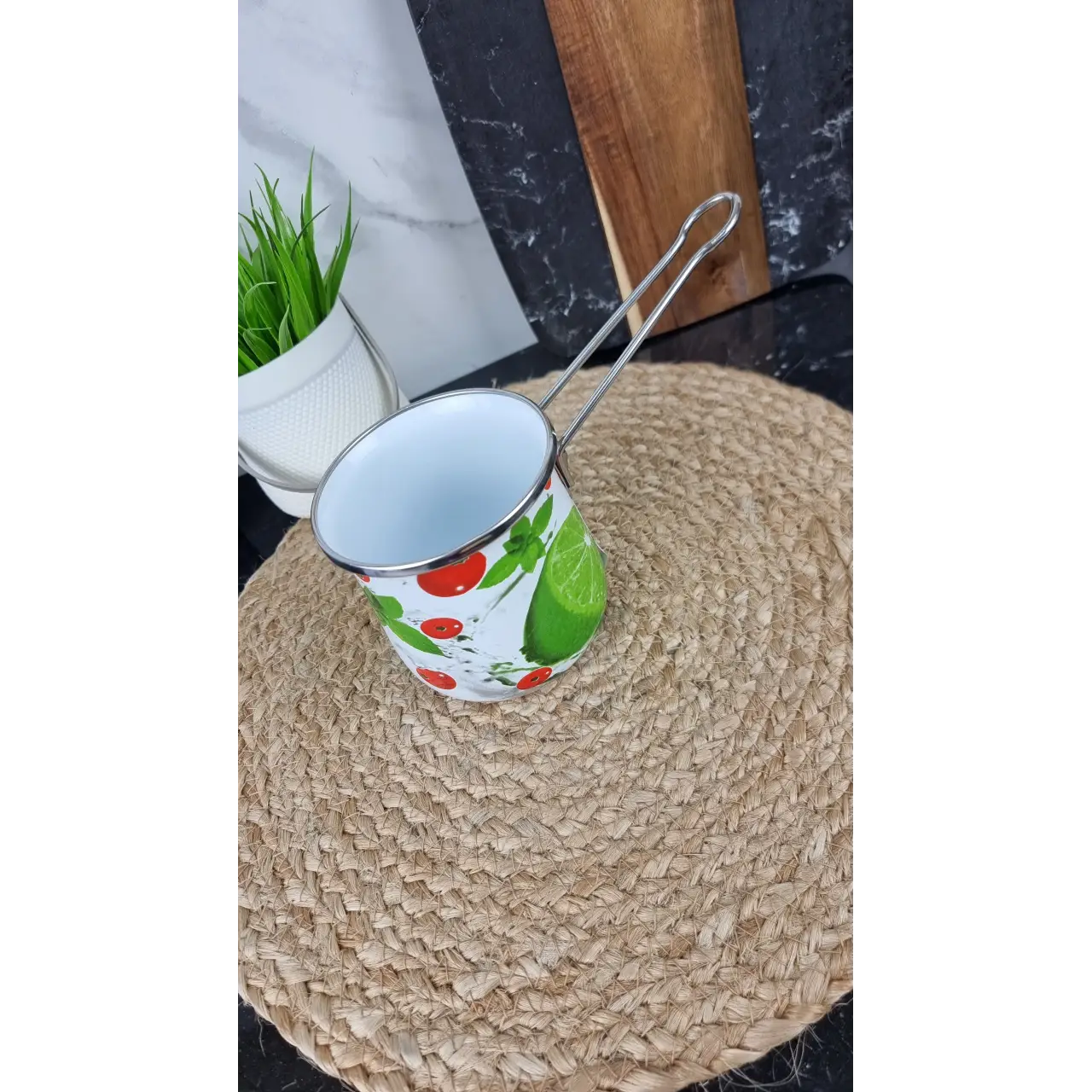 Стильная турка объемом 600 мл идеально подходит для приготовления ароматного кофе по-восточному. Удобная форма обеспечивает правильное заваривание, а оптимальный объем позволяет приготовить несколько порций напитка одновременно. Яркий дизайн «Мохито» добавляет свежести и оригинальности вашей кухне.