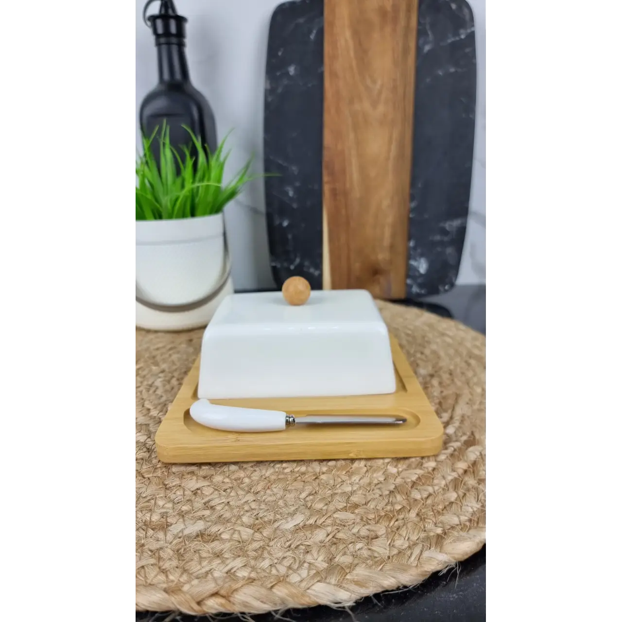 Масленка PJ02054 сочетает практичность и стильный дизайн: керамическая ёмкость с крышкой расположена на деревянной подставке и комплектуется специальным ножом для масла. Такой набор позволяет удобно хранить масло или намазки и эстетично подавать их на стол.