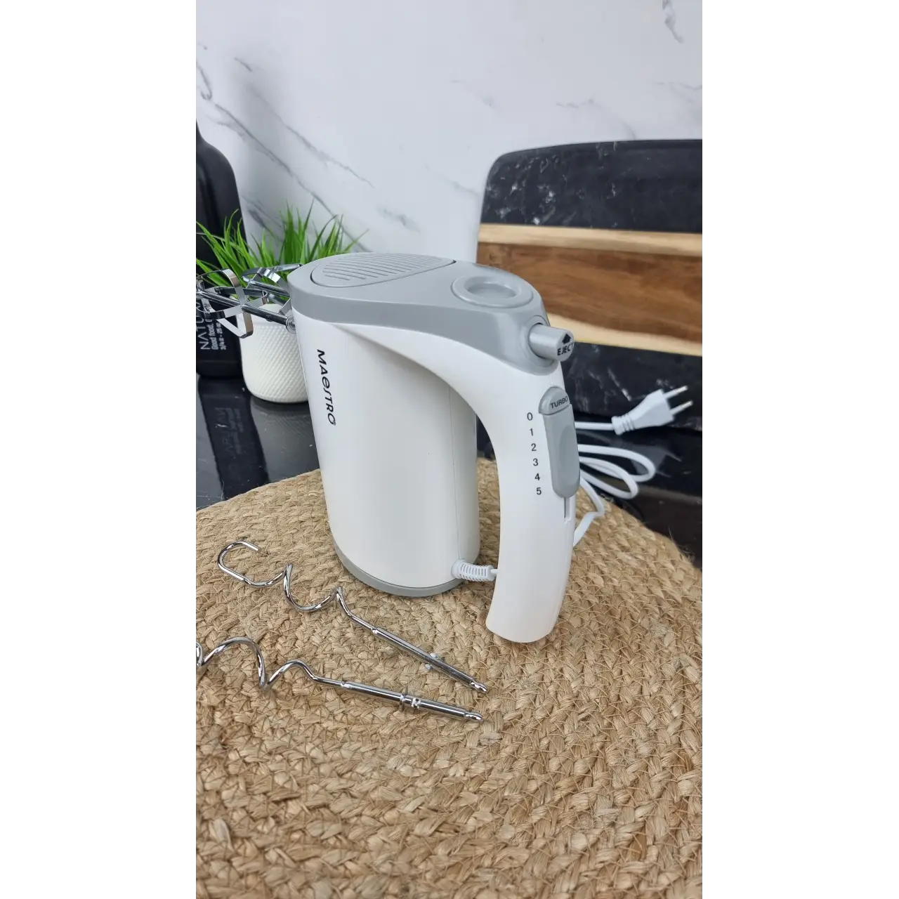 Этот ручной миксер оснащён мощным мотором 400 Вт и обеспечивает стабильную работу для самых распространённых кухонных задач: взбивания кремов, яиц и других смесей, а также перемешивания густого теста. Модель имеет 5 скоростных режимов и режим «Turbo», позволяющие подобрать оптимальную скорость под разные приготовления. В комплект входят два венчика для взбивания и две насадки‑крюка для замеса, а удобная кнопка для быстрого освобождения насадок делает эксплуатацию простой и безопасной. Белый корпус с серыми вставками смотрится стильно и подходит под любой кухонный интерьер. Эта модель станет надёжным помощником для ежедневного приготовления блюд и выпечки.