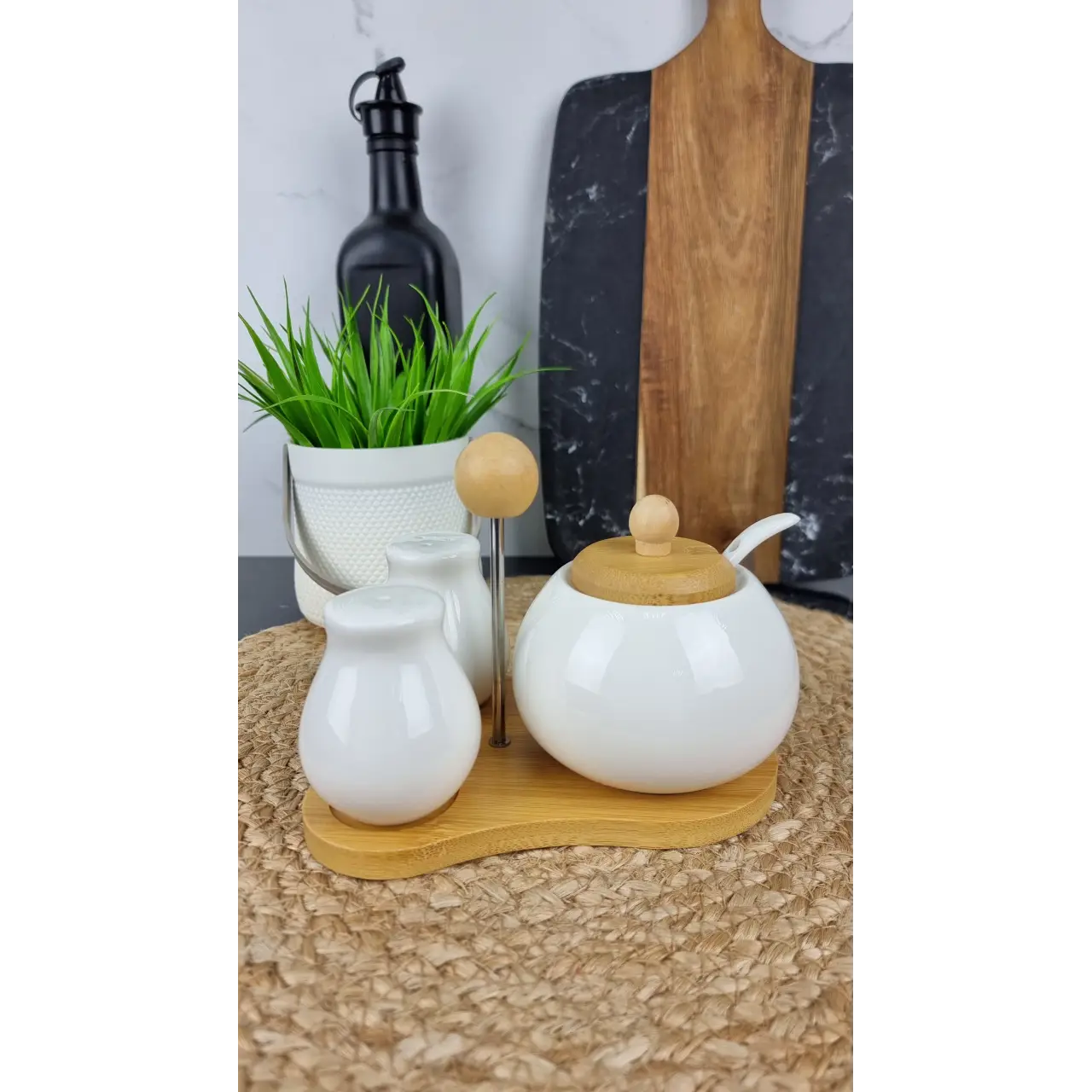 Набор PJ01643 состоит из трёх ёмкостей для соли, перца и сахара, размещённых на удобной деревянной стойке. Комплект сочетает функциональность и стильный дизайн, помогая поддерживать порядок на кухне или обеденном столе.