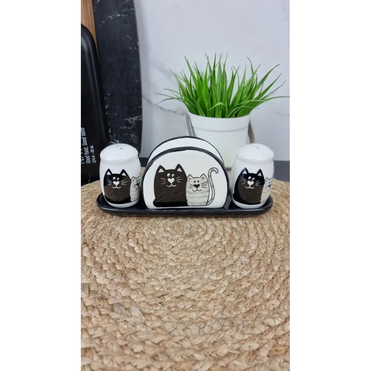Стильный набор Мурчики станет отличным дополнением к сервировке стола. Изготовлен из прочного доломита, он сочетает практичность и привлекательный дизайн. В комплект входят ёмкости для соли и перца, а также салфетница, размещённые на удобной керамической подставке.