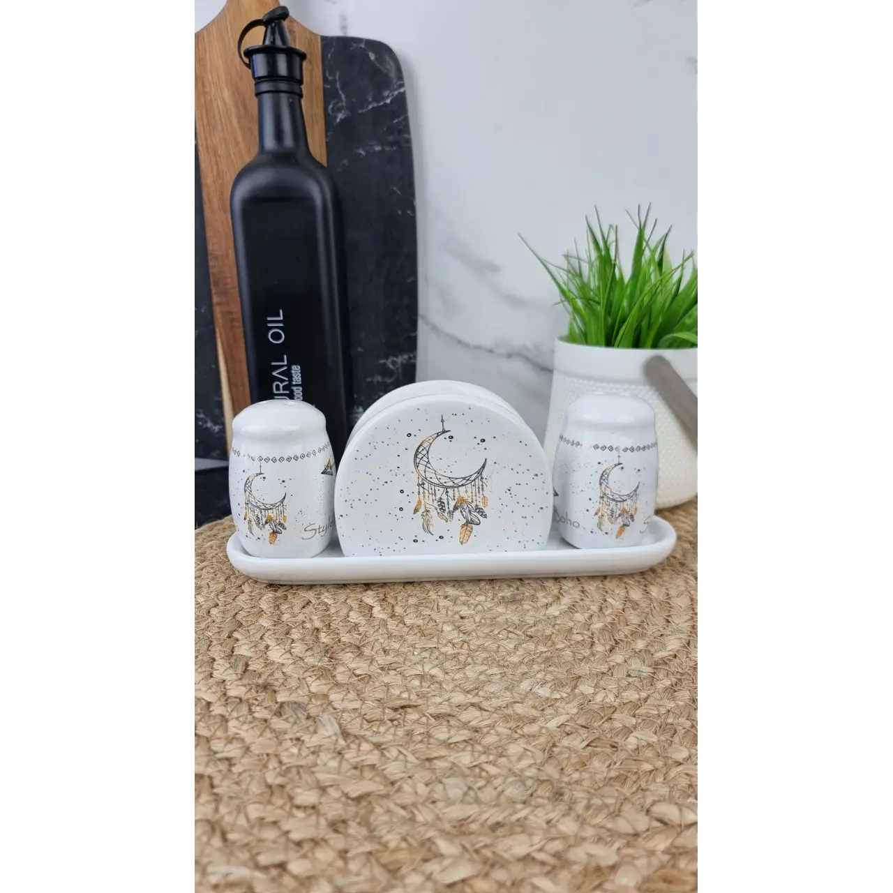 Элегантный набор Boho style станет стильным акцентом на вашем столе. Изготовлен из прочного доломита, он сочетает долговечность и современный дизайн. В комплект входят ёмкости для соли и перца, а также салфетница, размещённые на удобной керамической подставке.