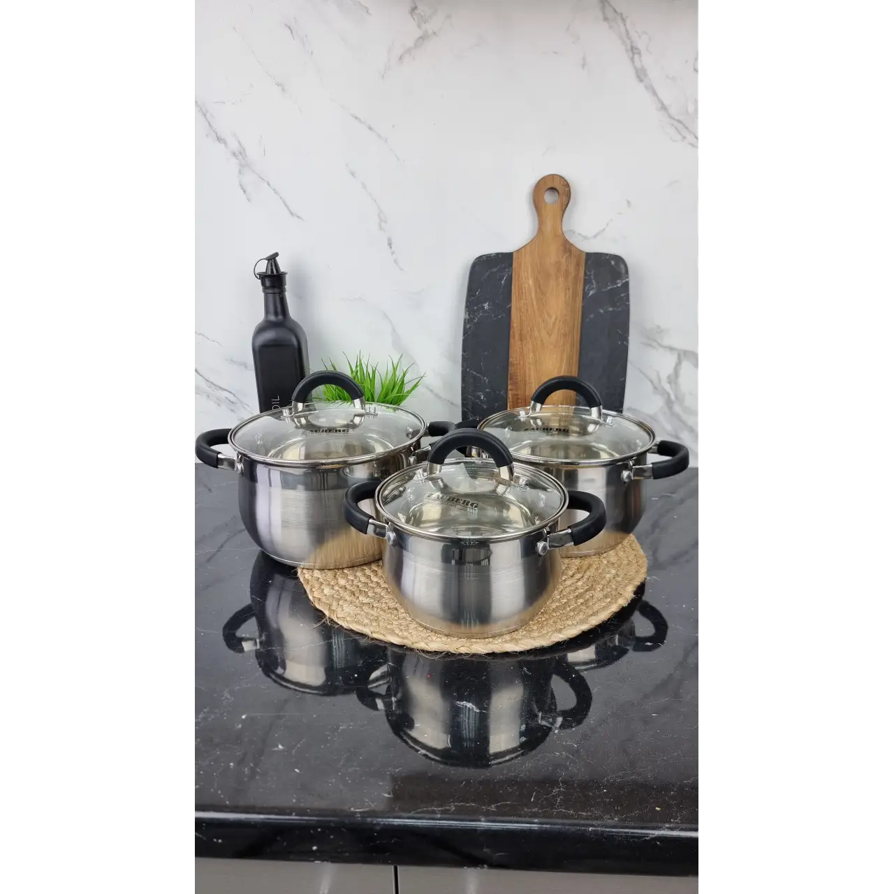 Комплект поставляется с крышками из жаропрочного стекла, каждая крышка имеет отверстие для выхода пара. Благодаря универсальному дизайну набор станет отличным подарком как для дома, так и для заведений общественного питания.
