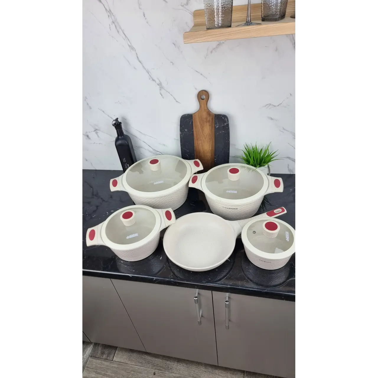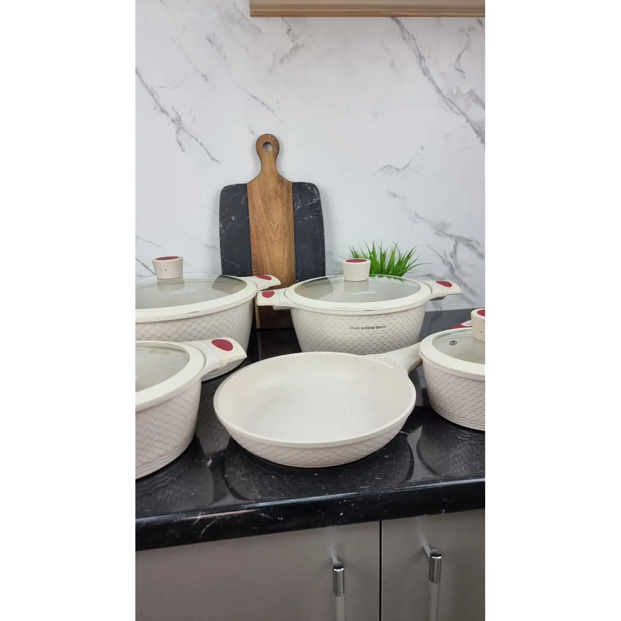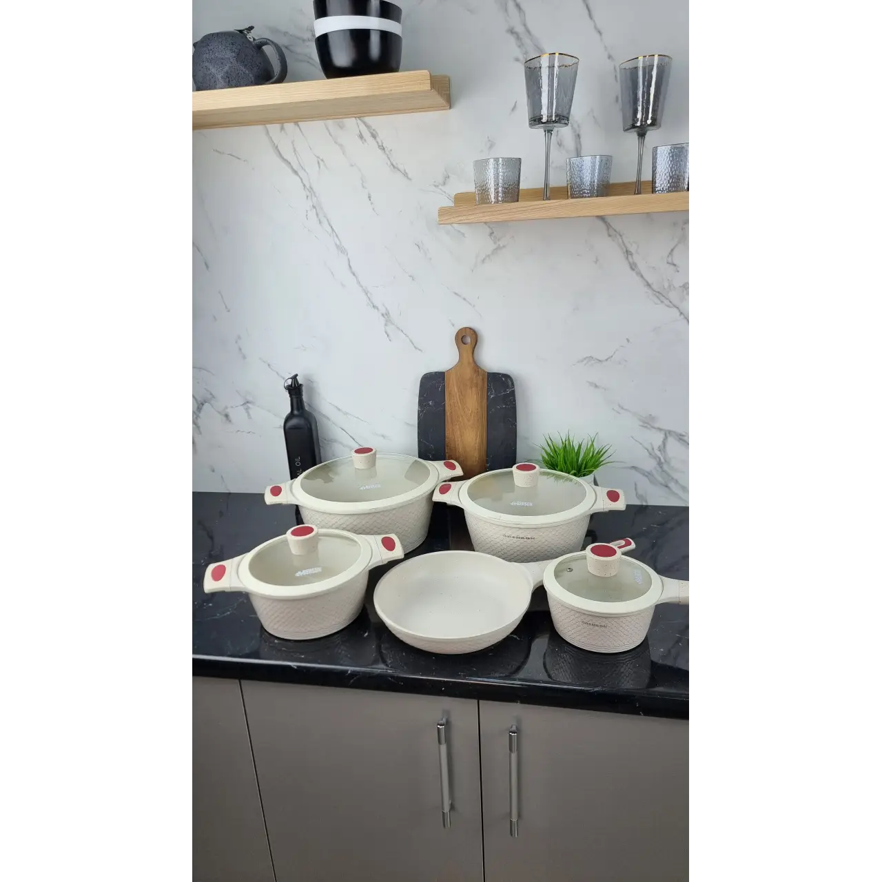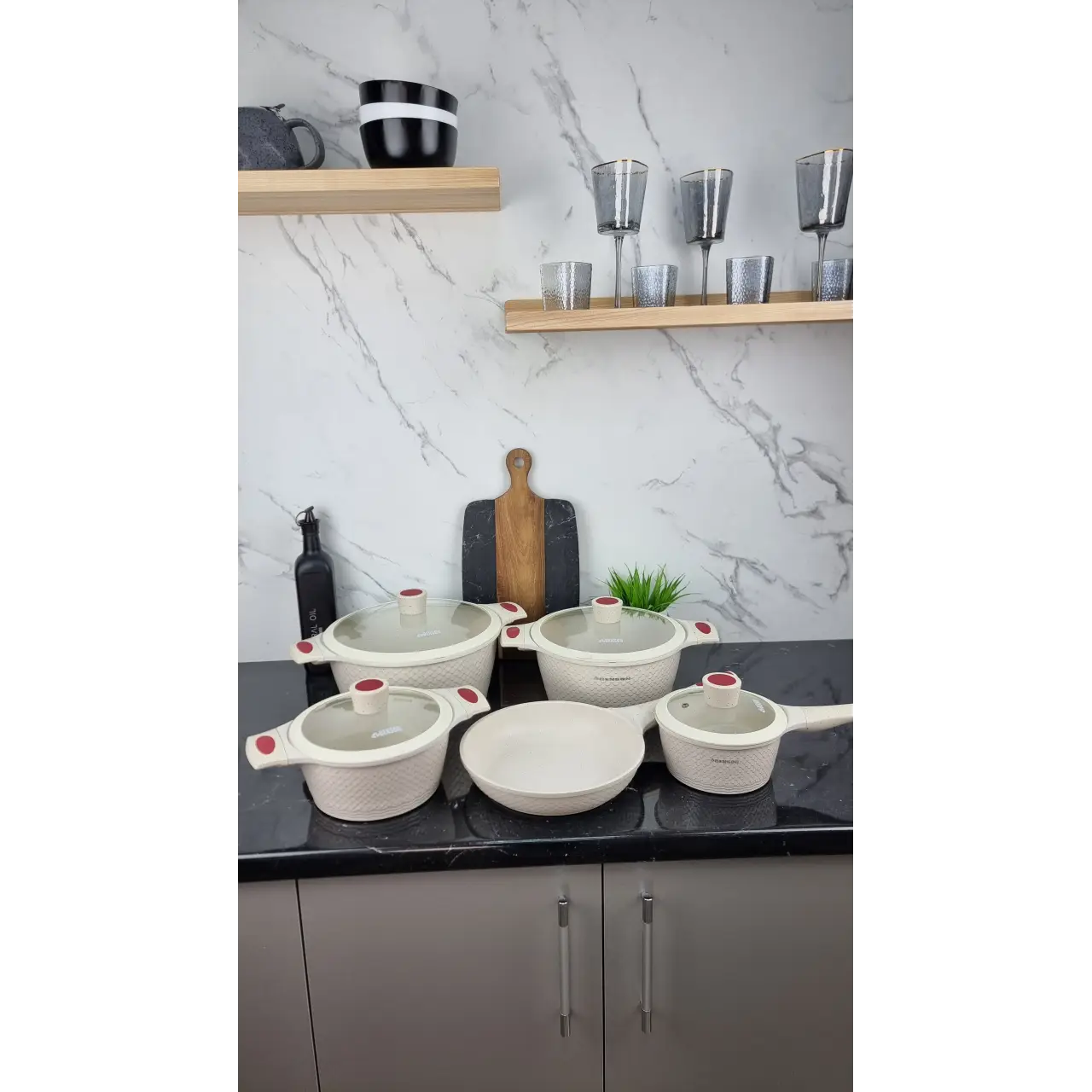 Мраморное антипригарное покрытие обеспечивает лёгкое переворачивание блюд, минимальное использование масла и равномерный нагрев. Кастрюли оснащены стеклянными крышками для контроля процесса готовки и прочными ручками для безопасного использования. Набор практичен для ежедневного использования и легко моется.