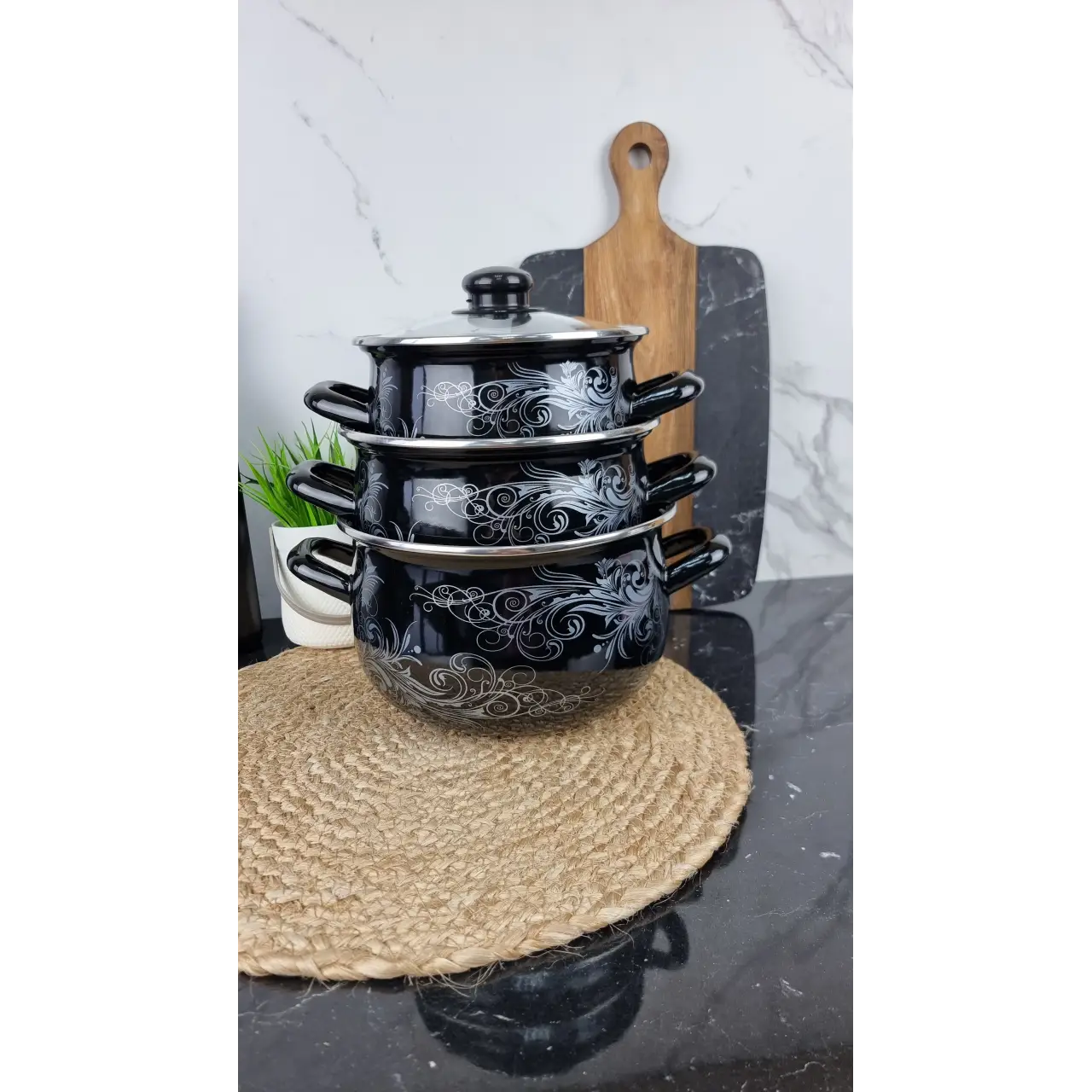 Каждая кастрюля оснащена стеклянной крышкой с отверстием для выхода пара, что позволяет удобно контролировать процесс приготовления. Общий вес набора составляет 3 кг.