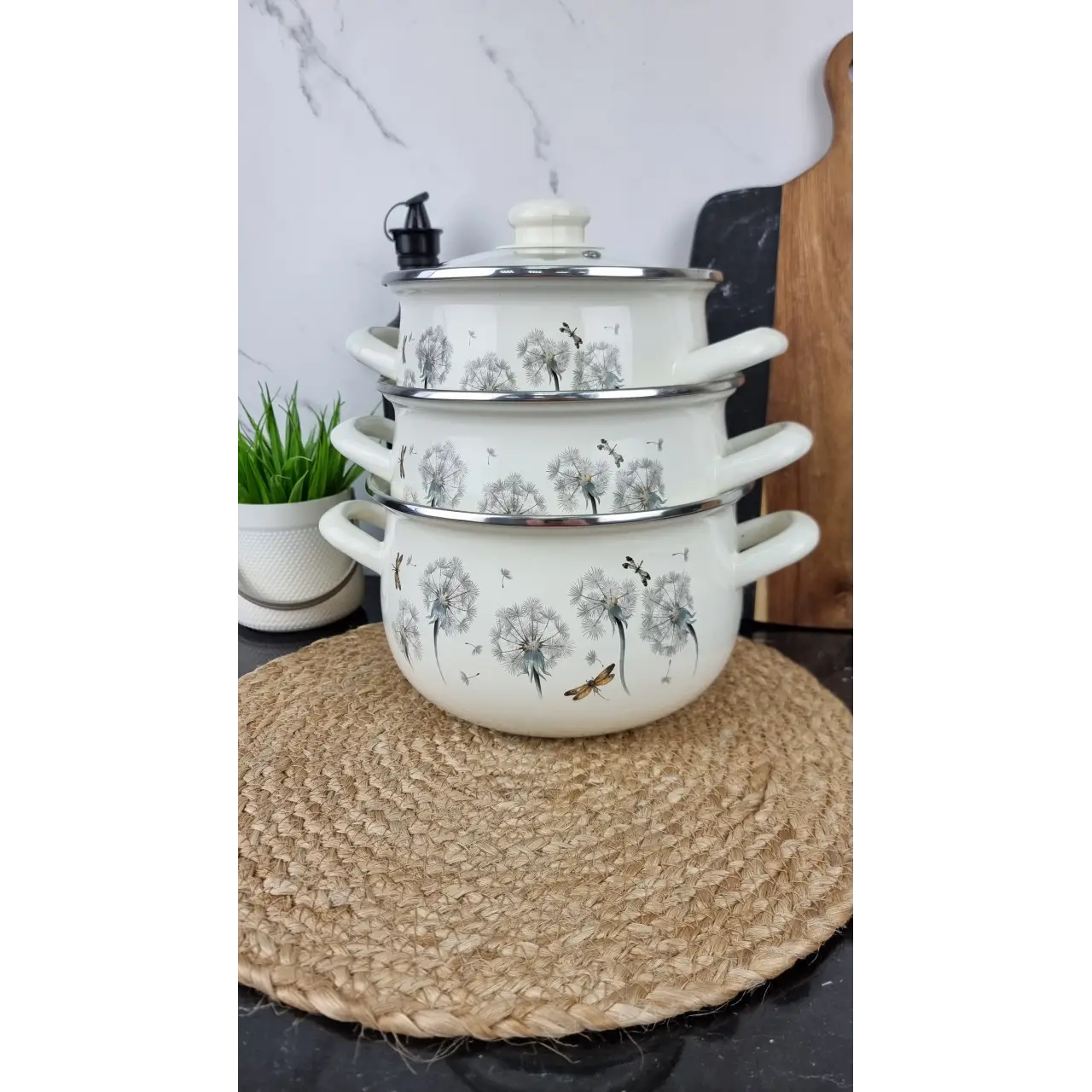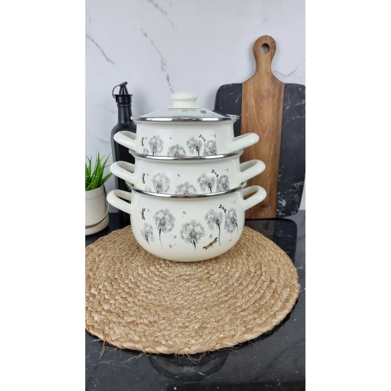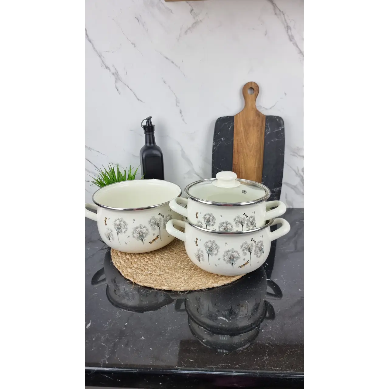 Эмалированное покрытие безопасно для продуктов, не влияет на вкус пищи и легко очищается. Стеклянные крышки позволяют контролировать процесс приготовления без необходимости открывать кастрюлю. Дизайн «Одуванчик» добавляет лёгкости и свежести кухонному интерьеру.