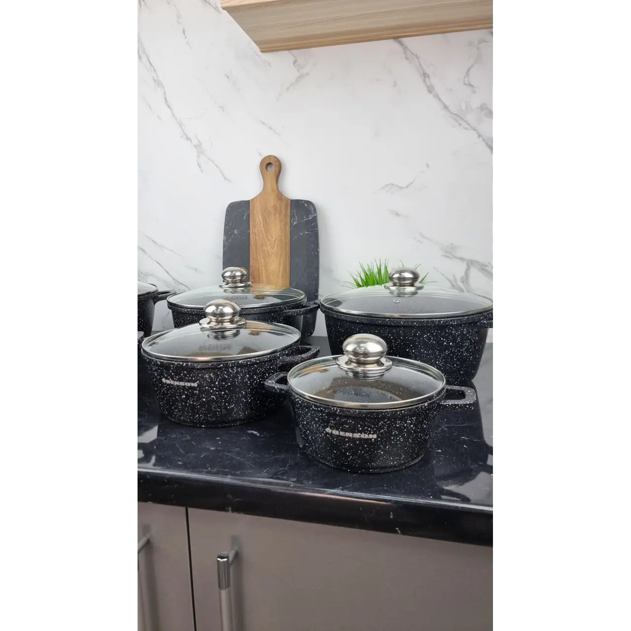 Мраморное покрытие обеспечивает антипригарные свойства, равномерный нагрев и лёгкое переворачивание блюд. Кастрюли оснащены стеклянными крышками для контроля процесса готовки и прочными ручками для безопасного использования. Набор практичен для ежедневного использования и легко моется.