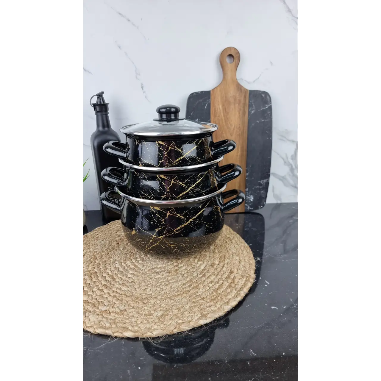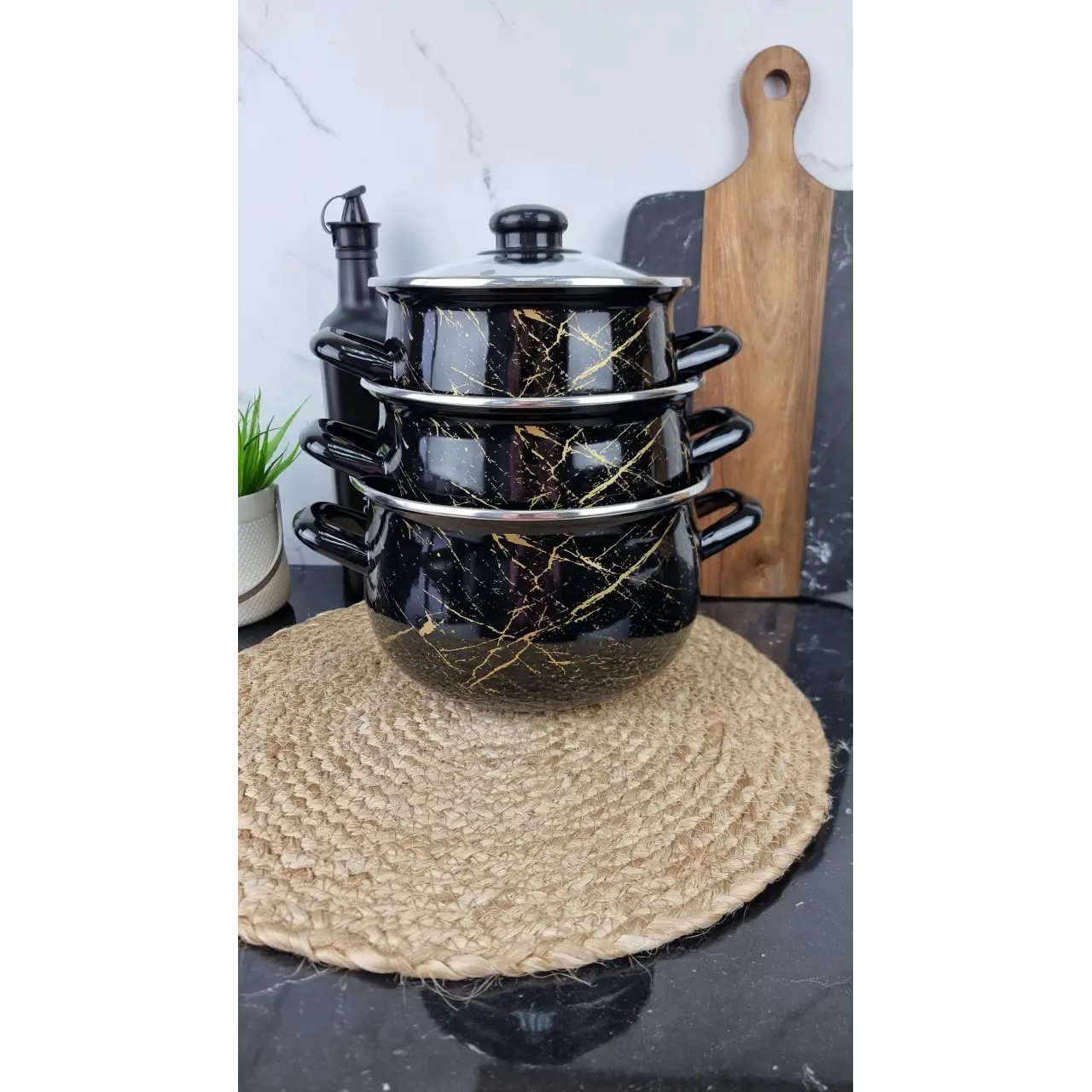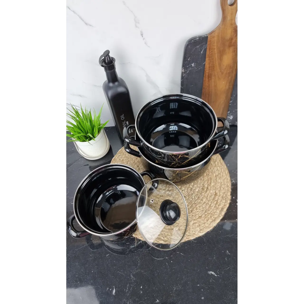 ✨ 700 A Набор кастрюль 3 пр. со стеклянными крышками "Черный Мрамор"