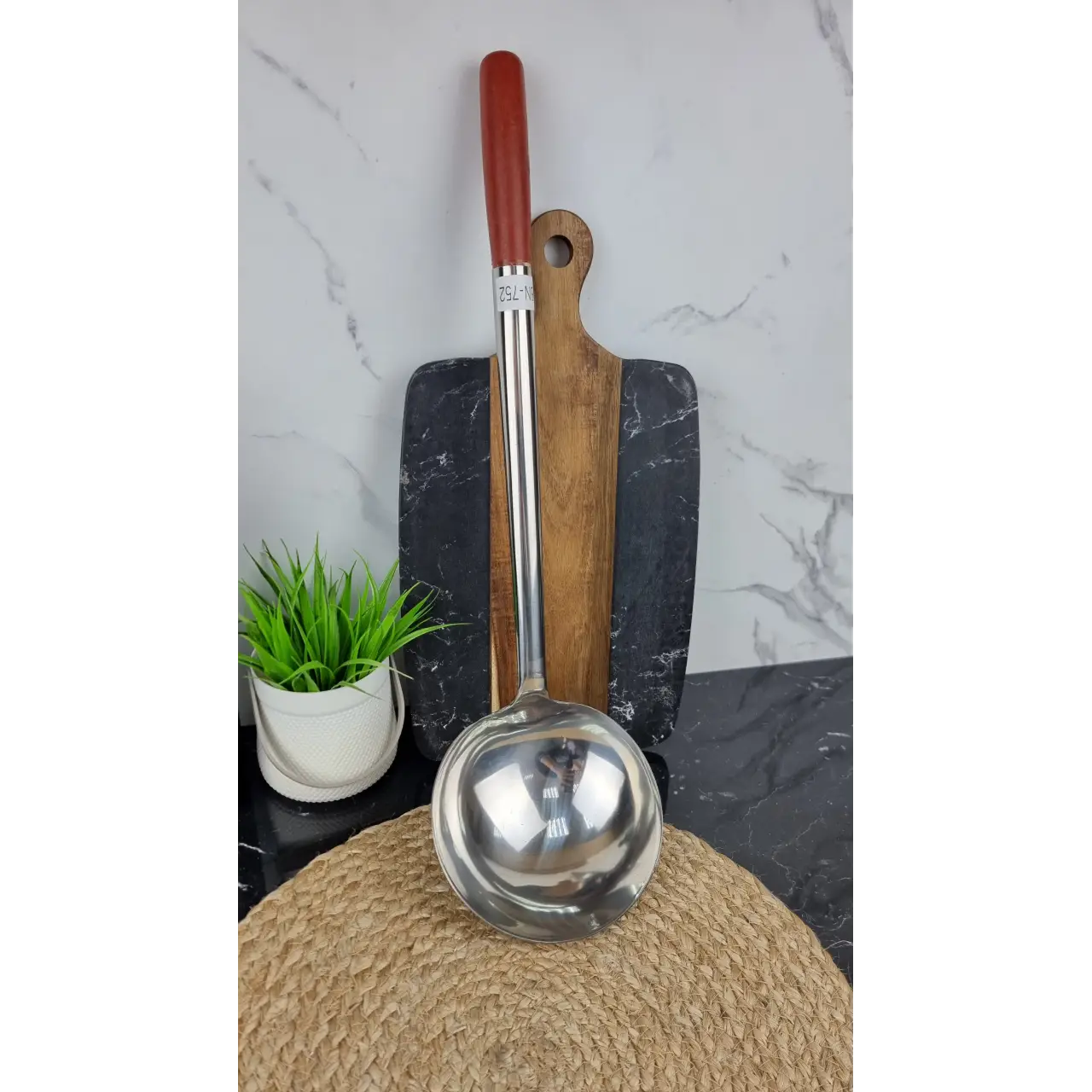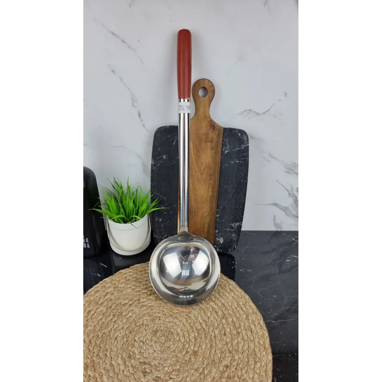 Половник BN-752 длиной 40 см и объёмом 15 см изготовлен из нержавеющей стали. Идеально подходит для разливания супов, бульонов, соусов и других жидких блюд в домашнем и профессиональном использовании.