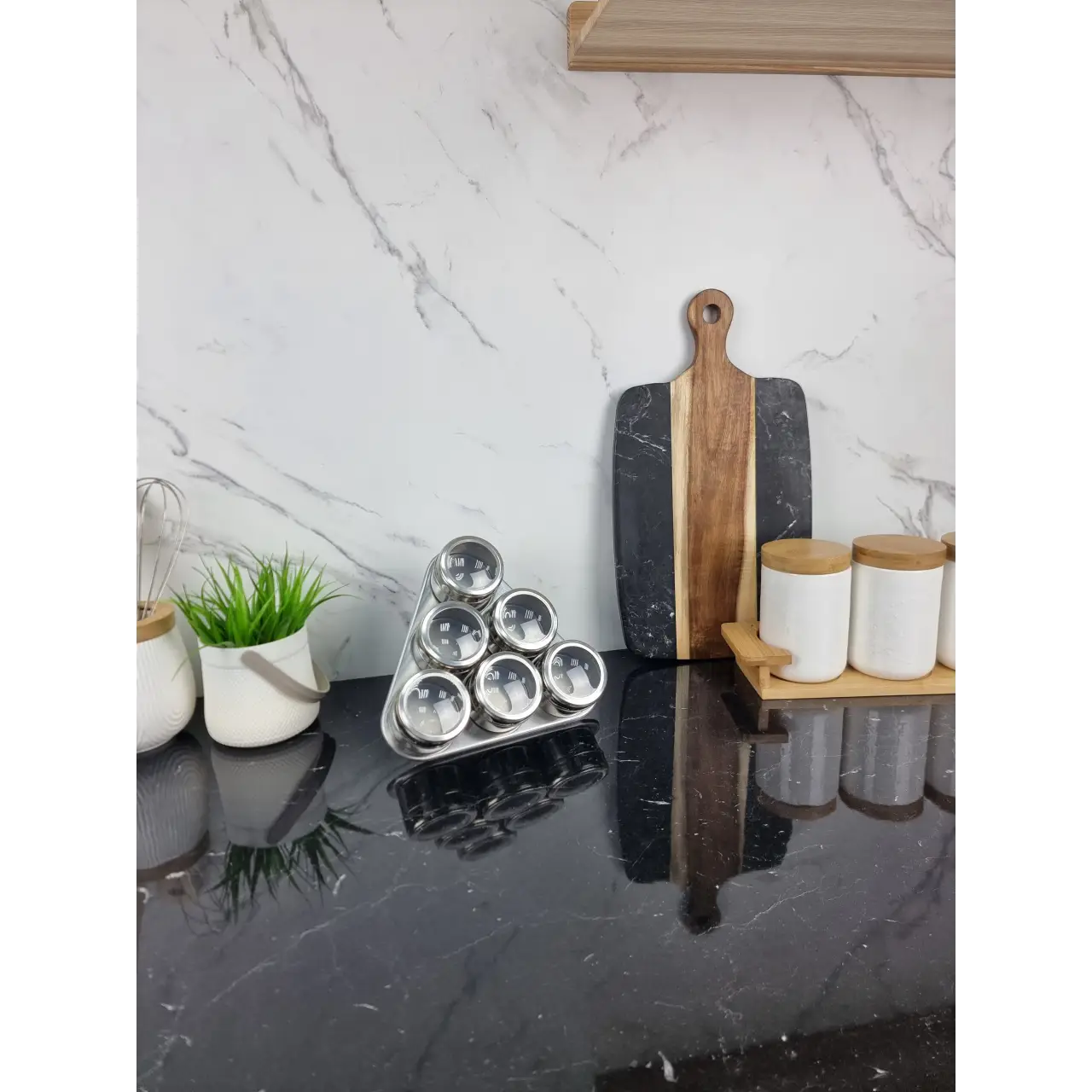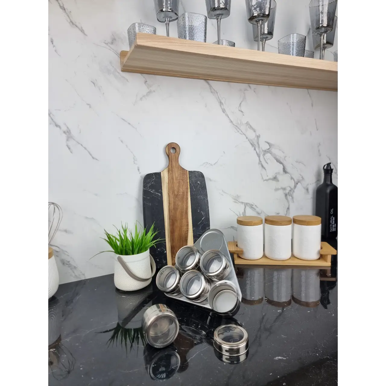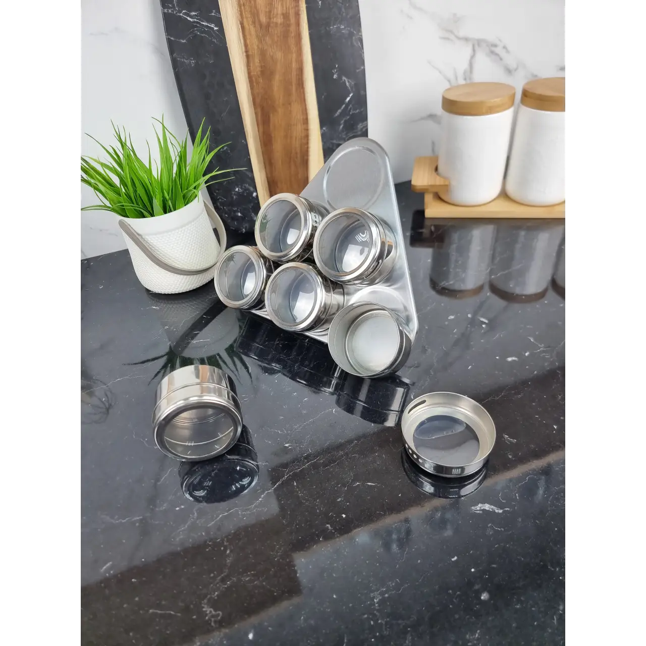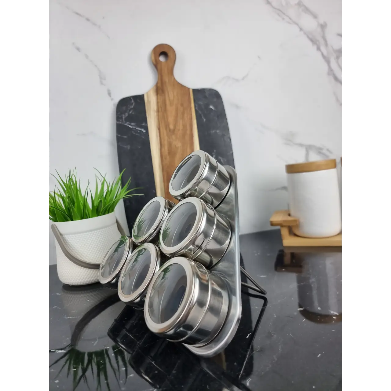 Удобство: Подставка обеспечивает легкий доступ к специям, а магнитное крепление позволяет быстро выбирать нужную баночку.