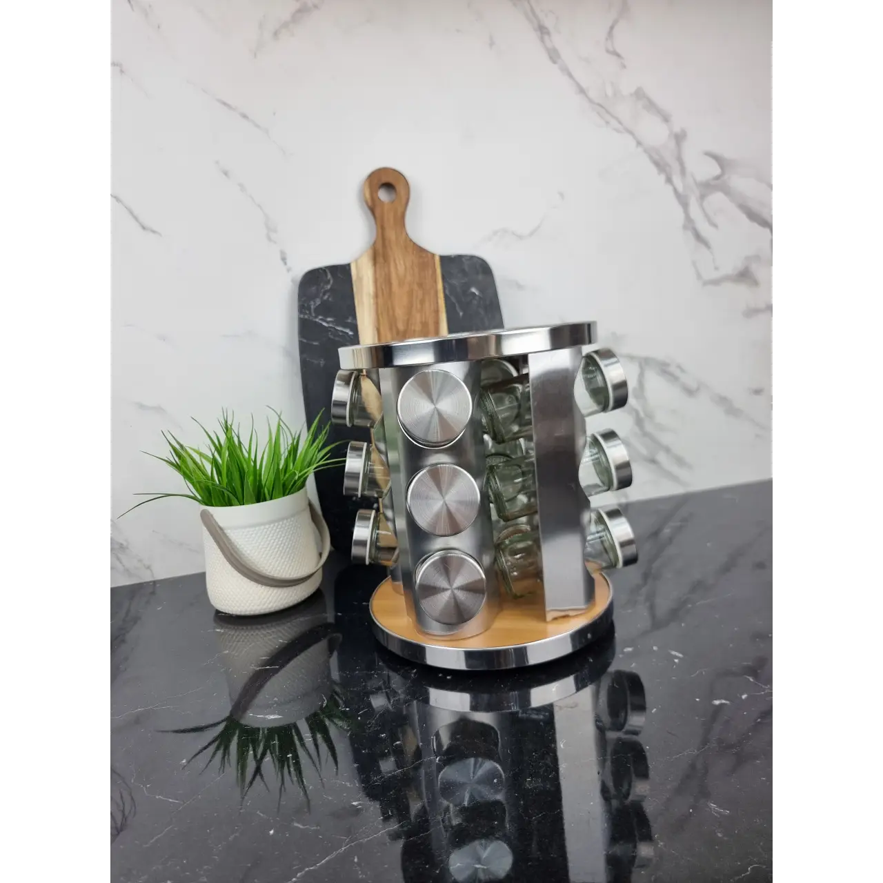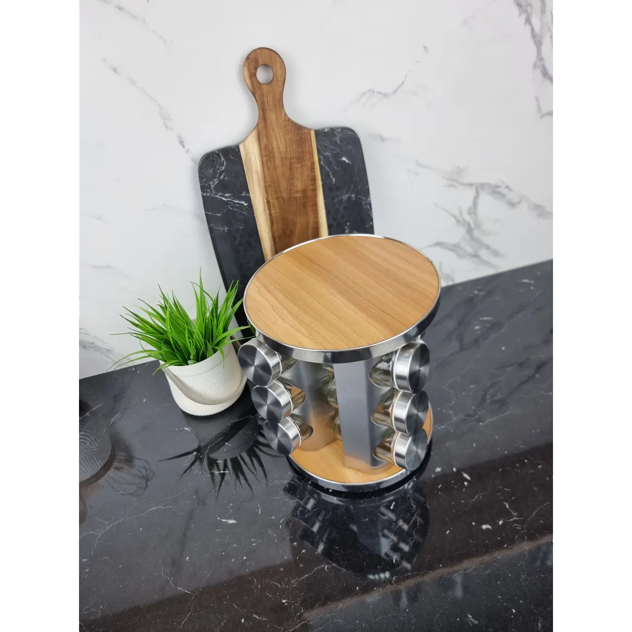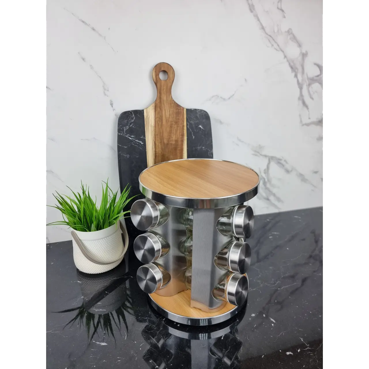 - Удобство и экономия пространства: Вращаясь, подставка занимает минимум места на кухне, одновременно обеспечивая доступ ко всем специям.