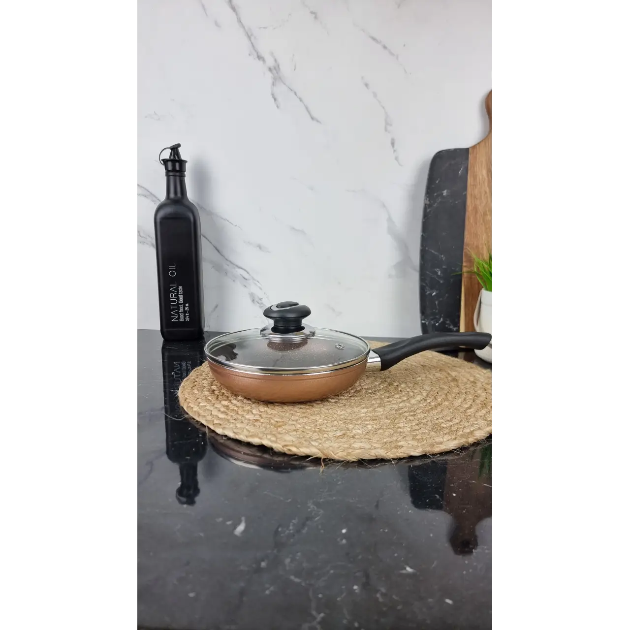 Стеклянная крышка с отверстием для выхода пара позволяет контролировать процесс приготовления, сохраняя тепло и аромат блюда. Бронзовый корпус придаёт сковороде стильный вид и прочность конструкции.
