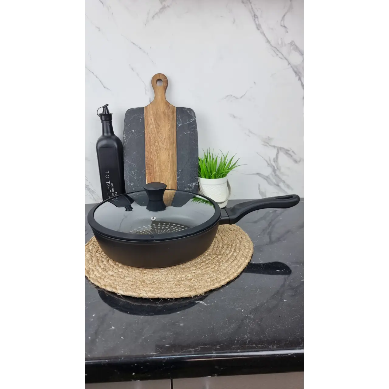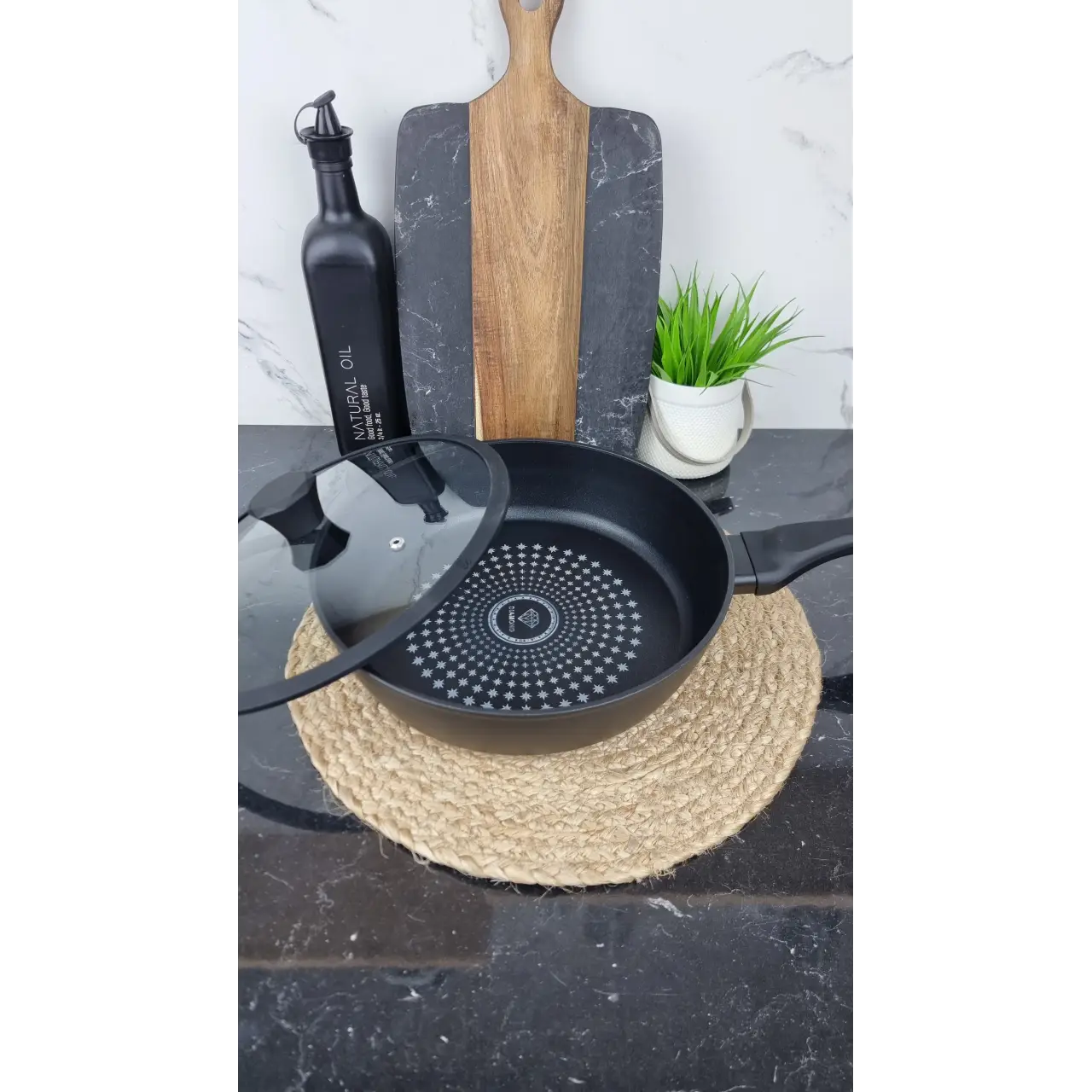 Алмазное антипригарное покрытие обеспечивает устойчивость к царапинам и долговечность. Стеклянная крышка с силиконовым ободком защищает от брызг, а равномерное распределение тепла гарантирует оптимальный результат приготовления. Сковорода подходит для ежедневного использования и легко моется.