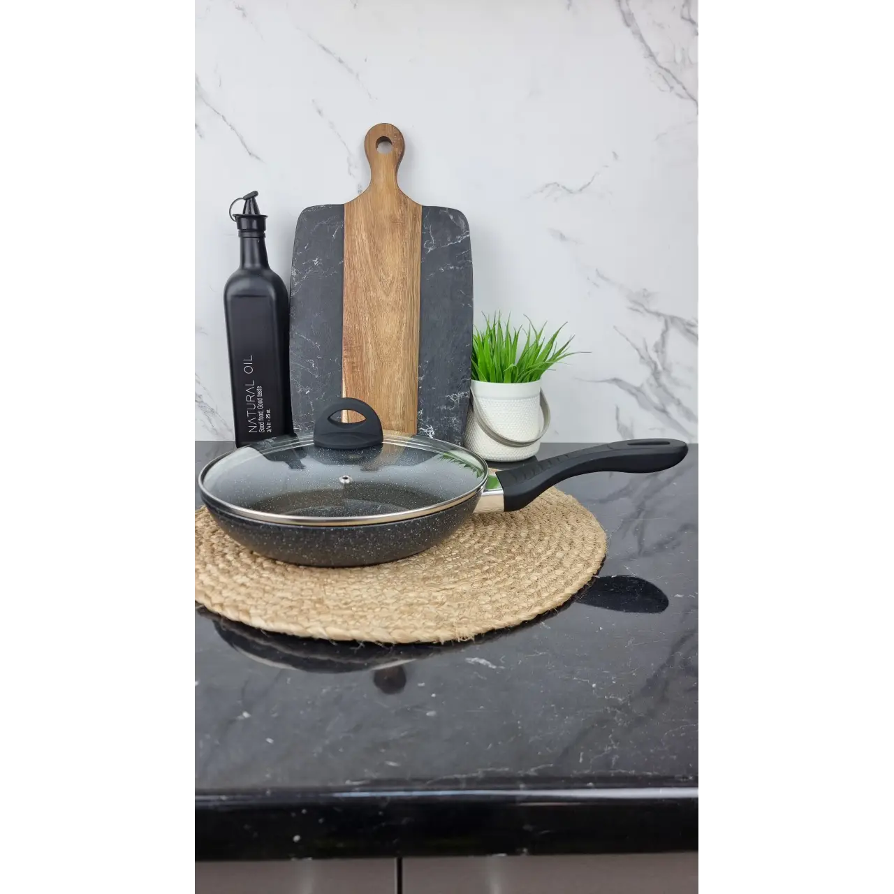 Антипригарное покрытие обеспечивает равномерное распределение тепла и лёгкое переворачивание продуктов. Стеклянная крышка позволяет контролировать процесс приготовления, а термоиндикатор подскажет, когда сковорода достигла оптимальной температуры для жарки, делая приготовление более удобным и эффективным.
