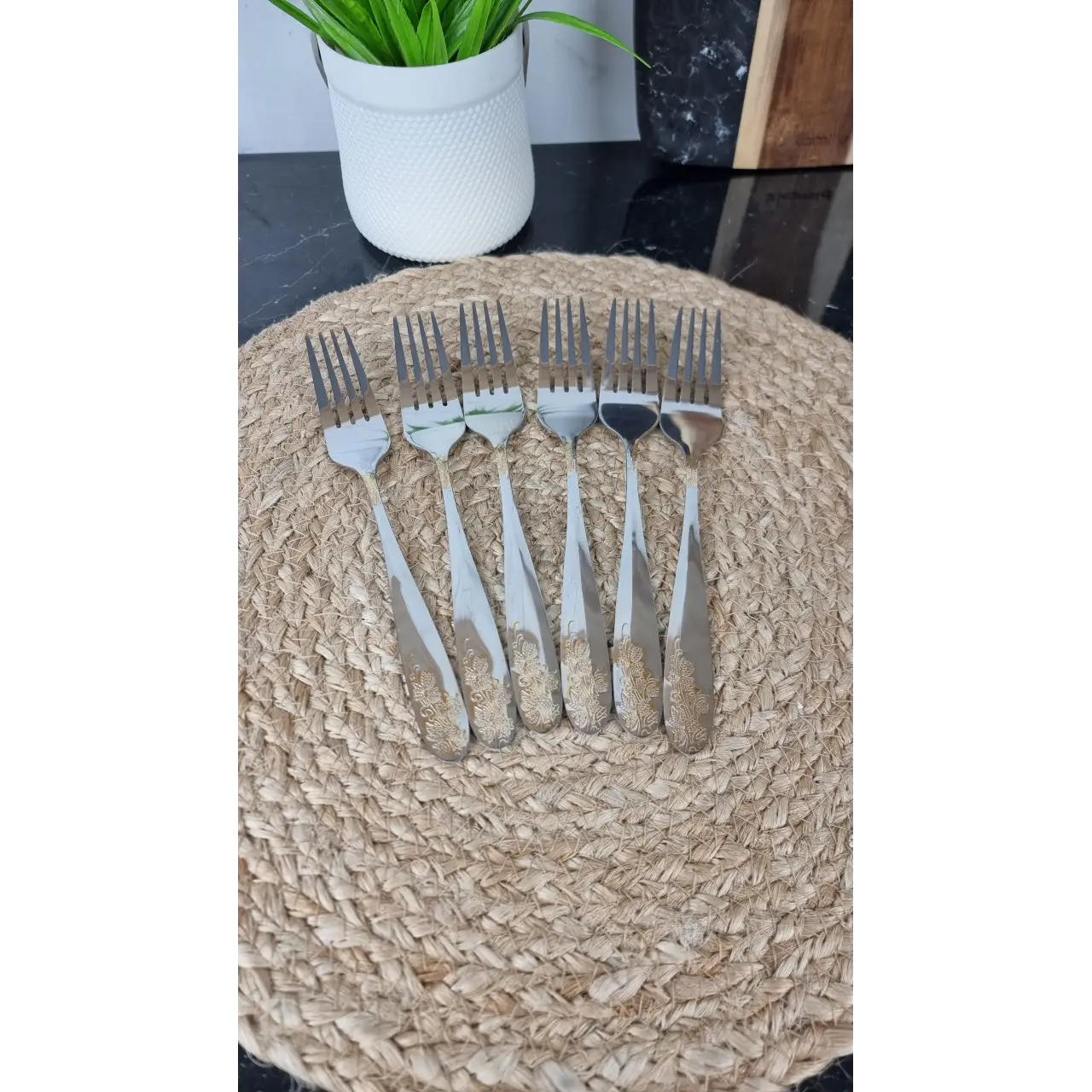 Нержавеющая сталь гарантирует сохранение первоначального вида прибора: он не деформируется, не окисляется под воздействием влаги или моющих средств. Золотой декор придаёт изящества и универсально сочетается с любой посудой и столовыми приборами. Вилку легко мыть вручную или в посудомоечной машине без применения агрессивной химии.