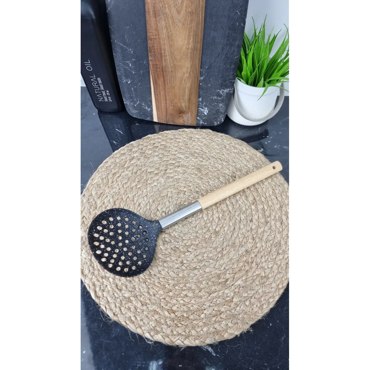 Шумовка BN-937 изготовлена из комбинации бакелита и дерева, что делает её прочной и устойчивой к высоким температурам. Она предназначена для удобного удаления пены, перемешивания и извлечения продуктов из жидкости во время варки. Благодаря материалу шумовка не царапает поверхность посуды и является лёгкой и эргономичной в использовании.