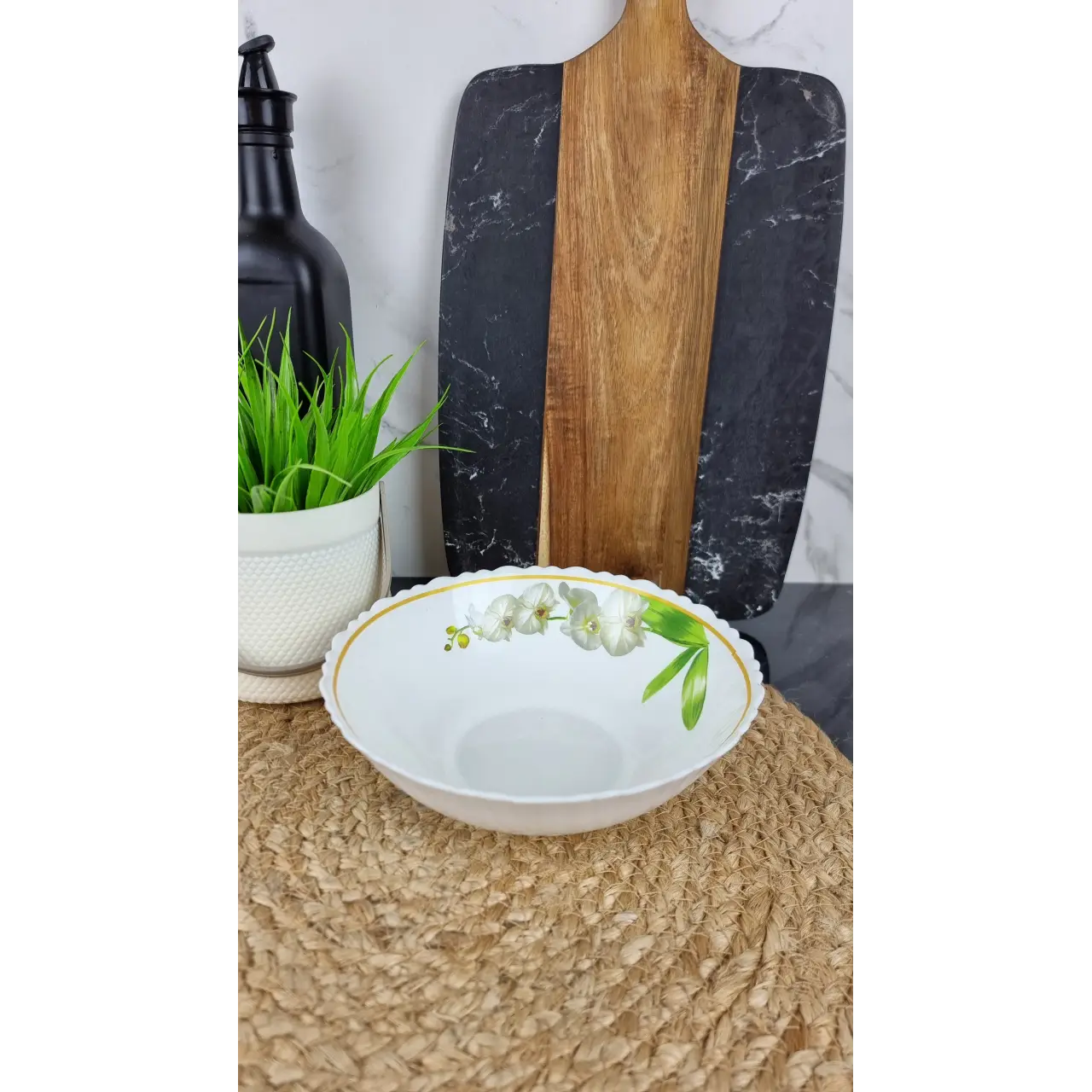 Салатник «Белая орхидея» BB 408, размер №7 (≈17,5 см), изготовлен из стеклокерамики с волнистым краем — стильная и практичная посуда для подачи салатов, закусок, фруктов или десертов. Прочная стеклокерамика устойчива к царапинам и высоким температурам. Волнистый край придаёт сервировке элегантность, а прозрачная или белая поверхность салатника позволяет красиво презентовать блюдо.