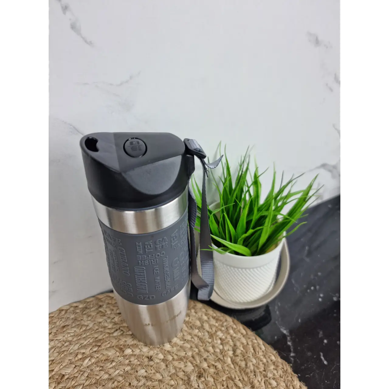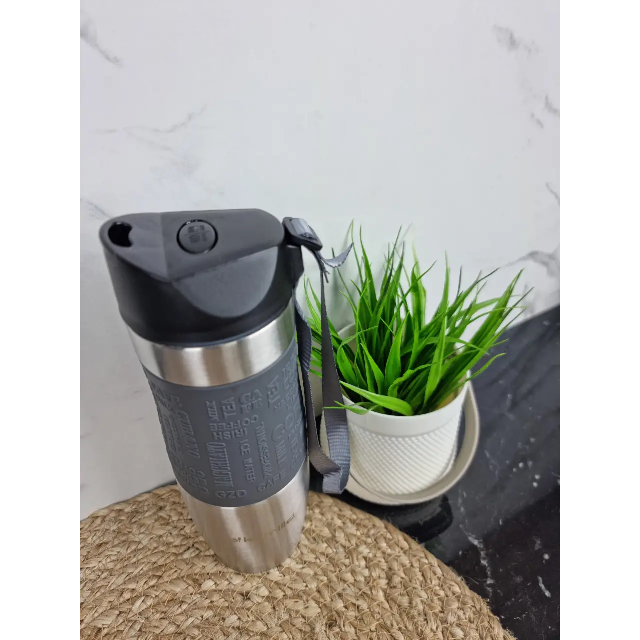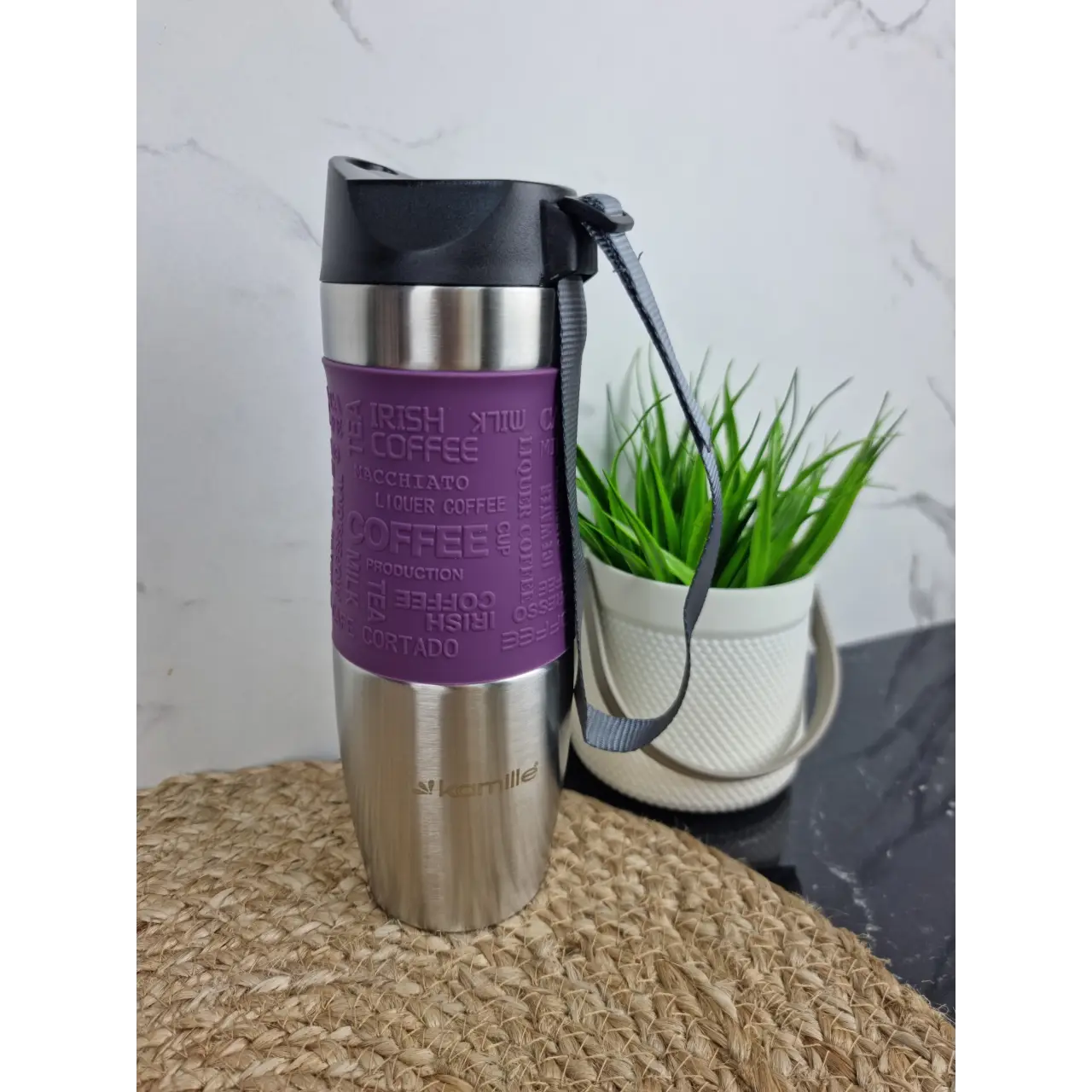 Термокружка 480мл из нерж.стали мягкая вставка с ремешком (сер.фиол.гол.беж.) 2051