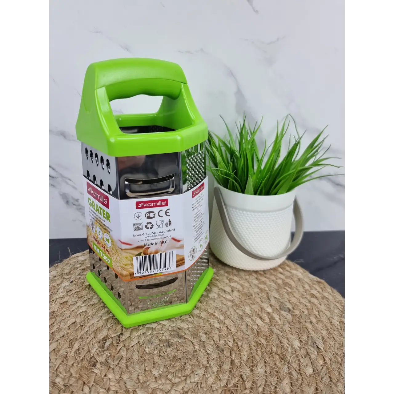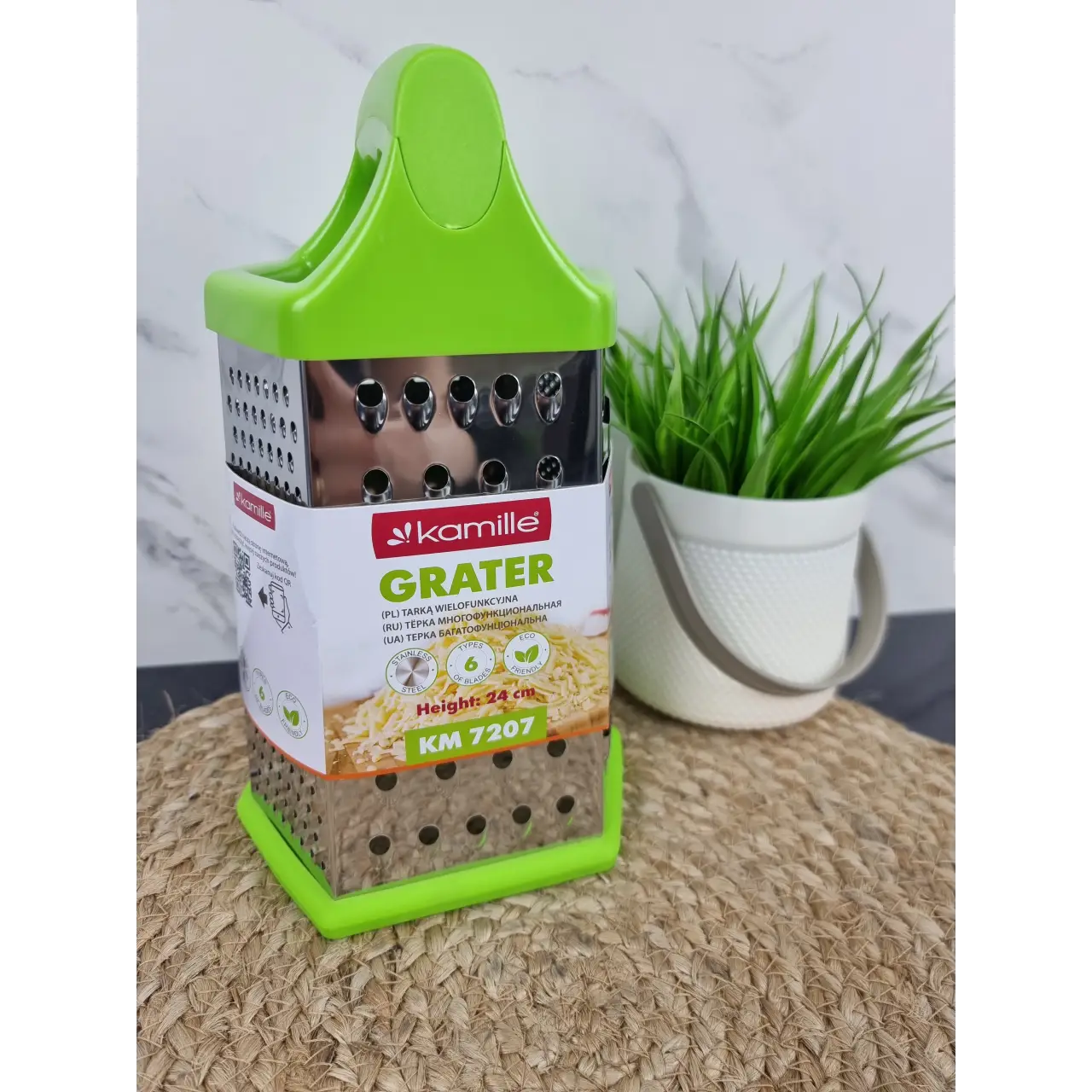 Многофункциональная компактная терка Kamille с качественной рабочей поверхностью позволит Вам быстро и аккуратно натереть необходимый продукт. Количество тертельных, режущих поверхностей: 6. Имеет антискользящую основу.