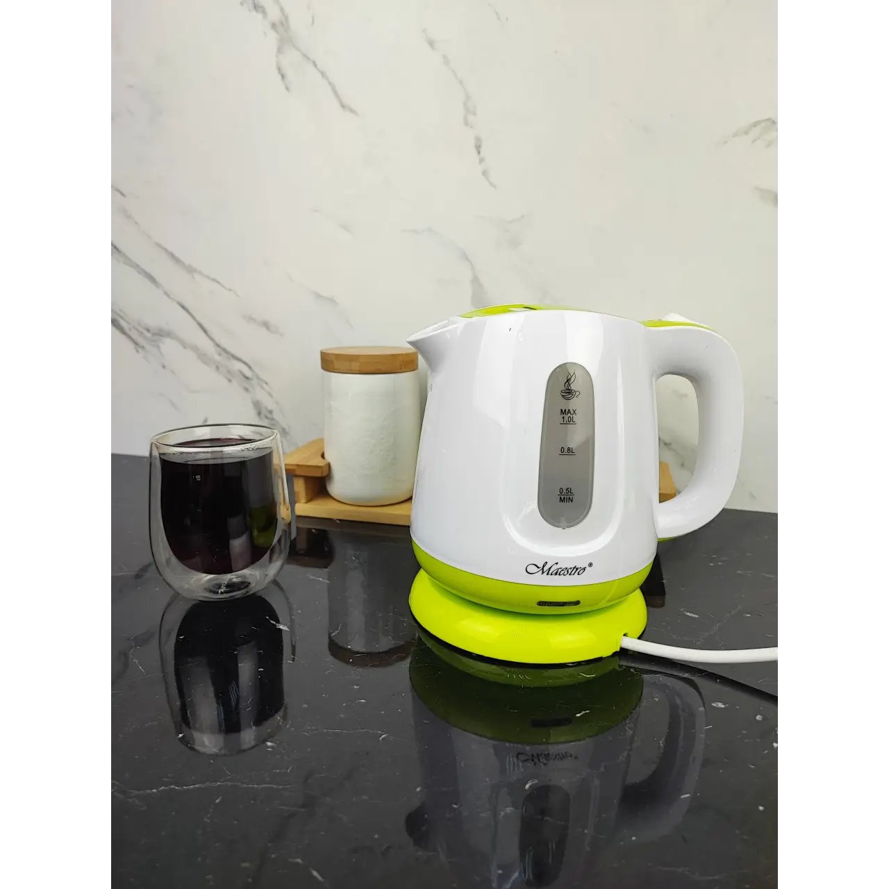 Електрочайник Maestro MR 013 об'ємом 1 л., потужністю 900-1100 Вт. Електричний чайник призначений для нагріву води до кипіння, оснащений функцією автоматичного вимкнення і захистом від перегріву. Модель має привабливий сучасний дизайн, вирізняється простотою в роботі та догляді. Прихований (дисковий) нагрівальний елемент зменшує утворення накипу і сприяє довгому терміну служби.