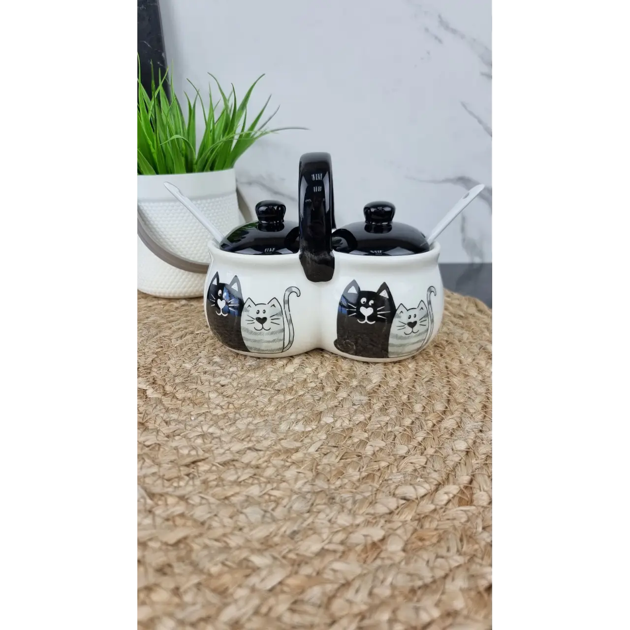 Банка для спецій «Мурчики» 6023-19 комплектом 2 шт., об’ємом по 300 мл кожна, розміром 16×9,5×11,5 см, виготовлена з доломіту та комплектується двома дерев’яними ложками. Вона призначена для зручного зберігання різних спецій на кухні.