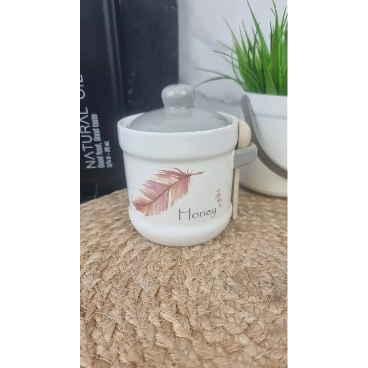 Керамічний корпус добре зберігає властивості продукту, а кришка захищає вміст від пилу та сторонніх запахів. Зручна дерев’яна ложка дозволяє легко набирати мед. Стильний дизайн робить банку гарним доповненням кухні або сервірування столу.
