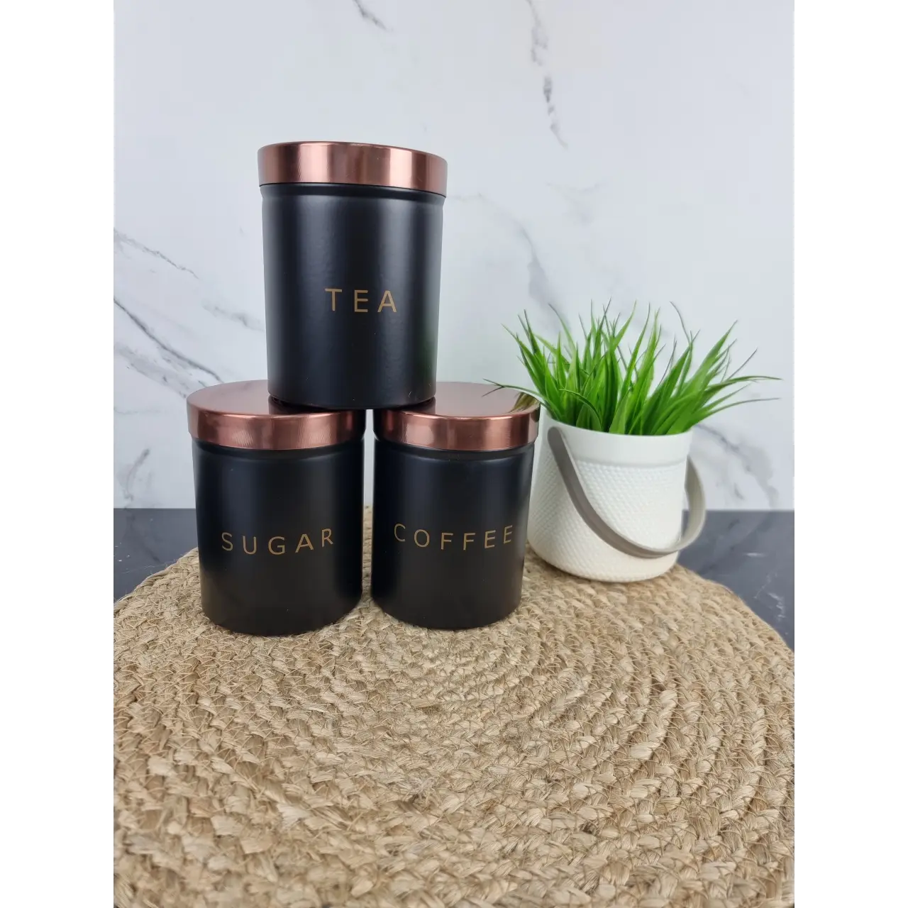 Цей набір із трьох металевих контейнерів стане зручним рішенням для охайного зберігання основних продуктів на кухні. Кожна ємність має розмір 9,5×12 см і підходить для цукру, кави та чаю.