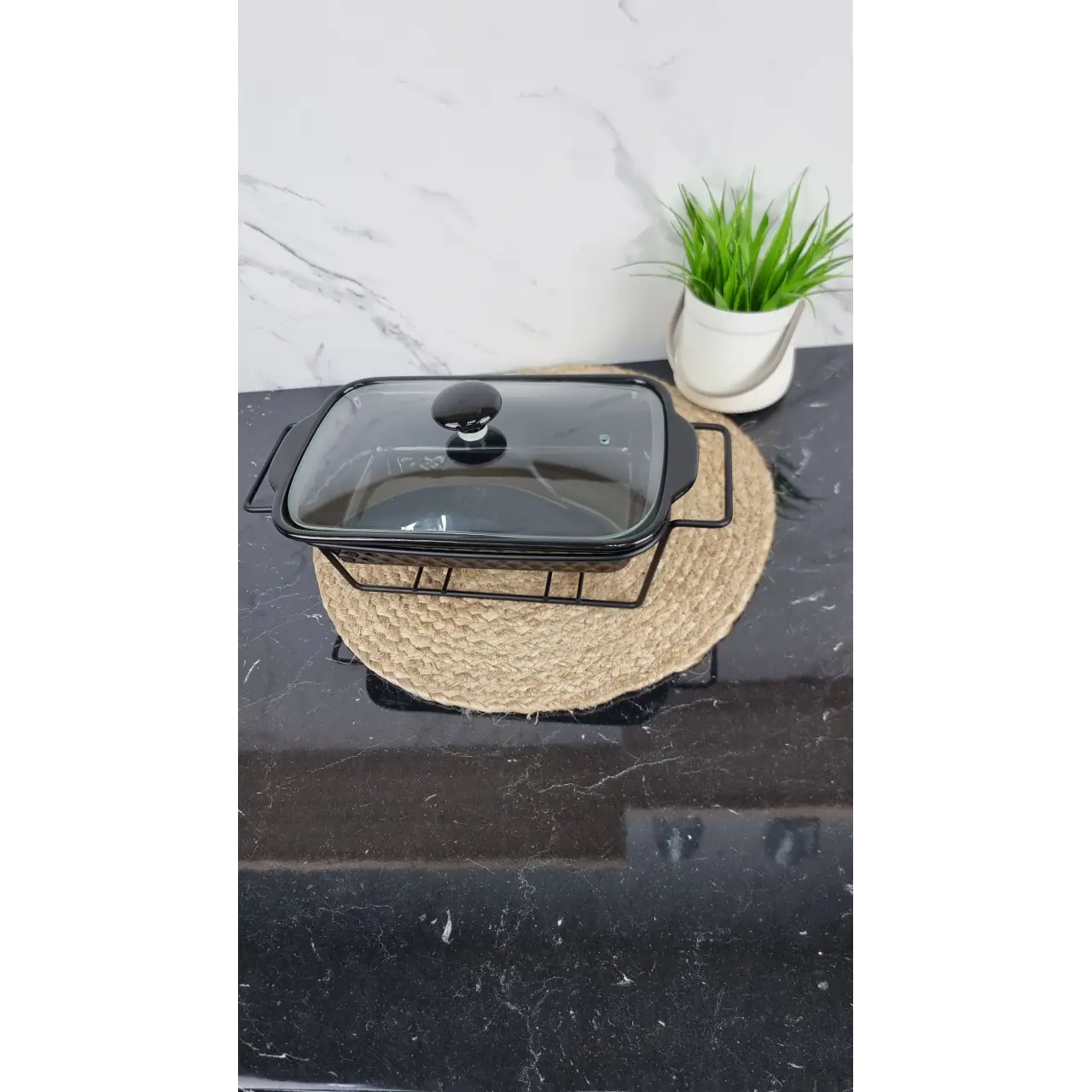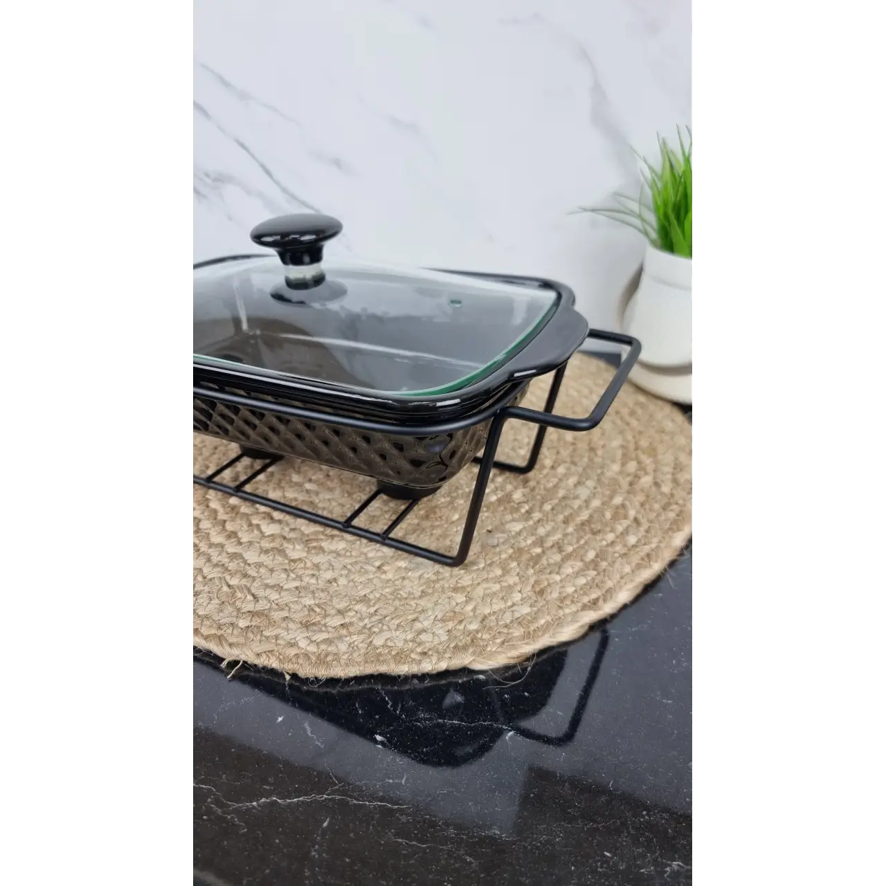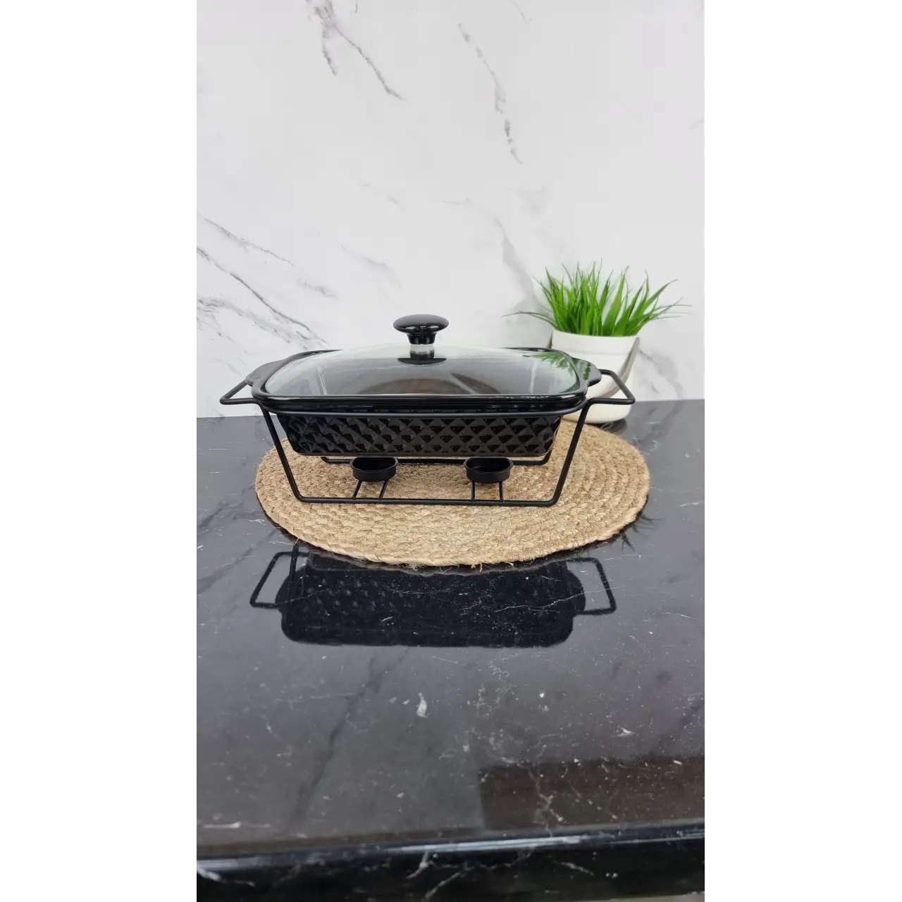 У комплект входить металева підставка, яка забезпечує зручність користування та захищає поверхню столу від нагрівання. Скляна кришка зберігає тепло всередині й дозволяє контролювати процес підігріву.