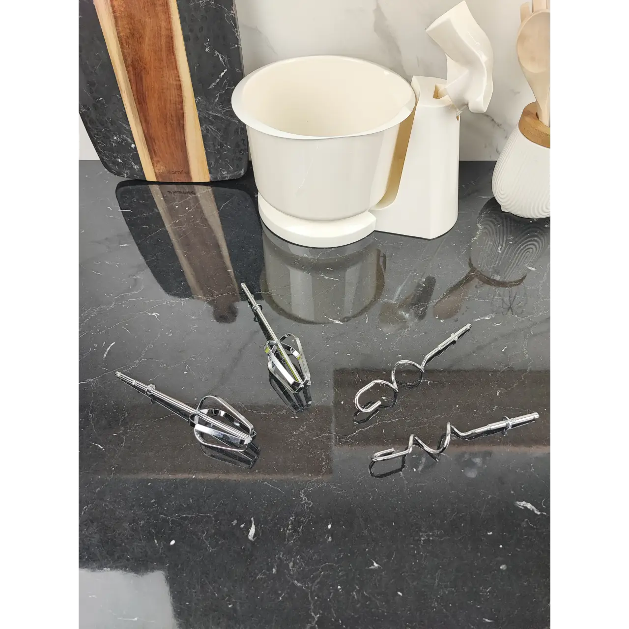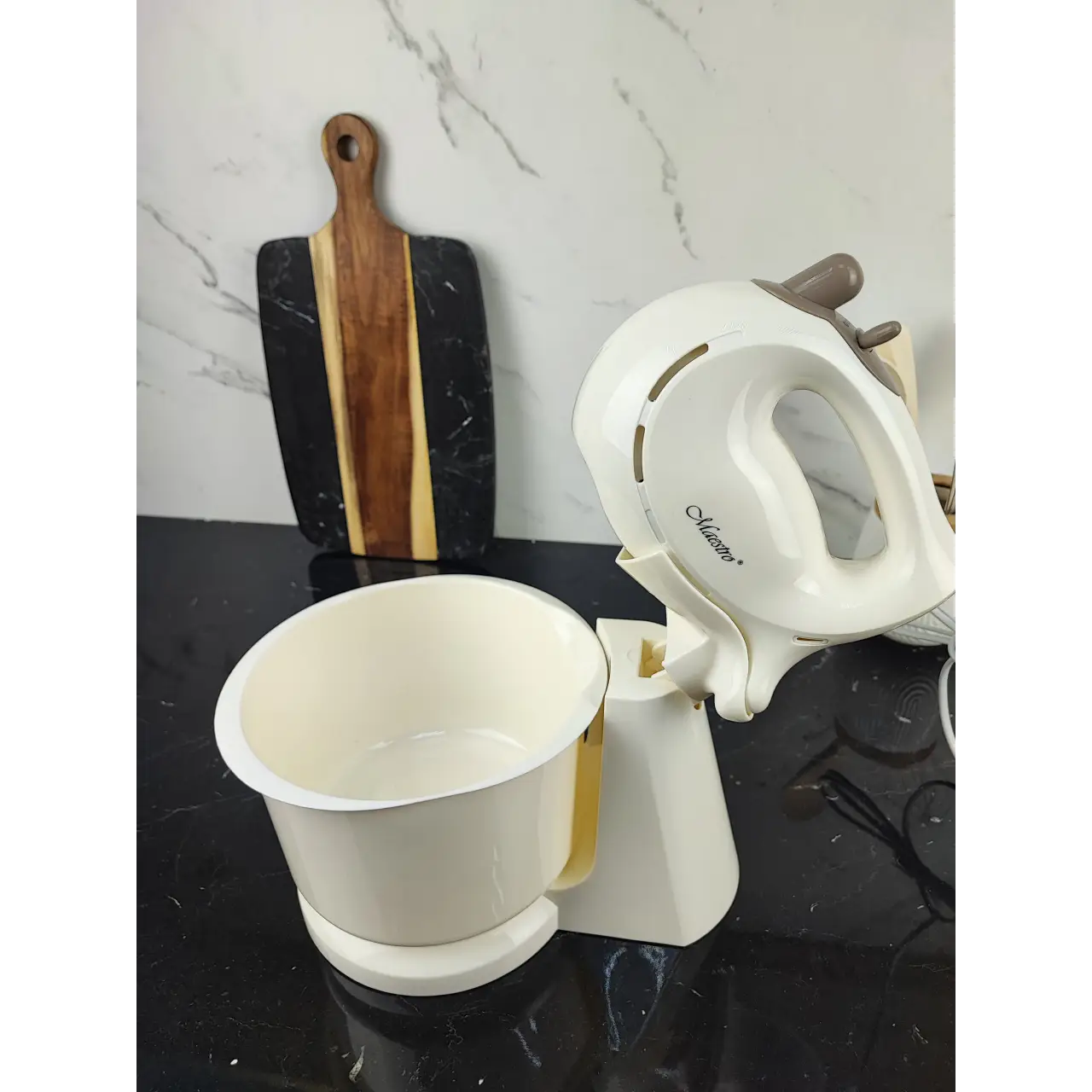 Дуже зручний Міксер із чашею MR-552. Звичайна модель на 300 ват. Має 4 насадки. Для крему і яєць, та дві для тіста. Створена для тих, хто не любить тримати в руках міксер під час збивання. Чаша з'ємна