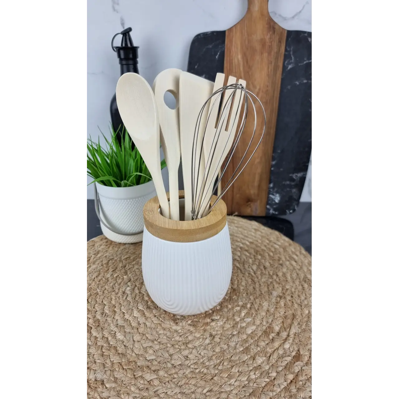 Цей набір кухонного приладдя — незамінний помічник для кожної господині. В комплект входять основні інструменти для приготування їжі,всі зручні для використання в процесі готування. Всі предмети виготовлені з міцних і безпечних матеріалів, що не пошкоджують посуд і не залишають подряпин. Набір оснащений зручною підставкою для зберігання, що дозволяє утримувати приладдя в порядку і забезпечує легкий доступ до потрібного інструменту. Стильний і функціональний дизайн підійде до будь-якої кухні.