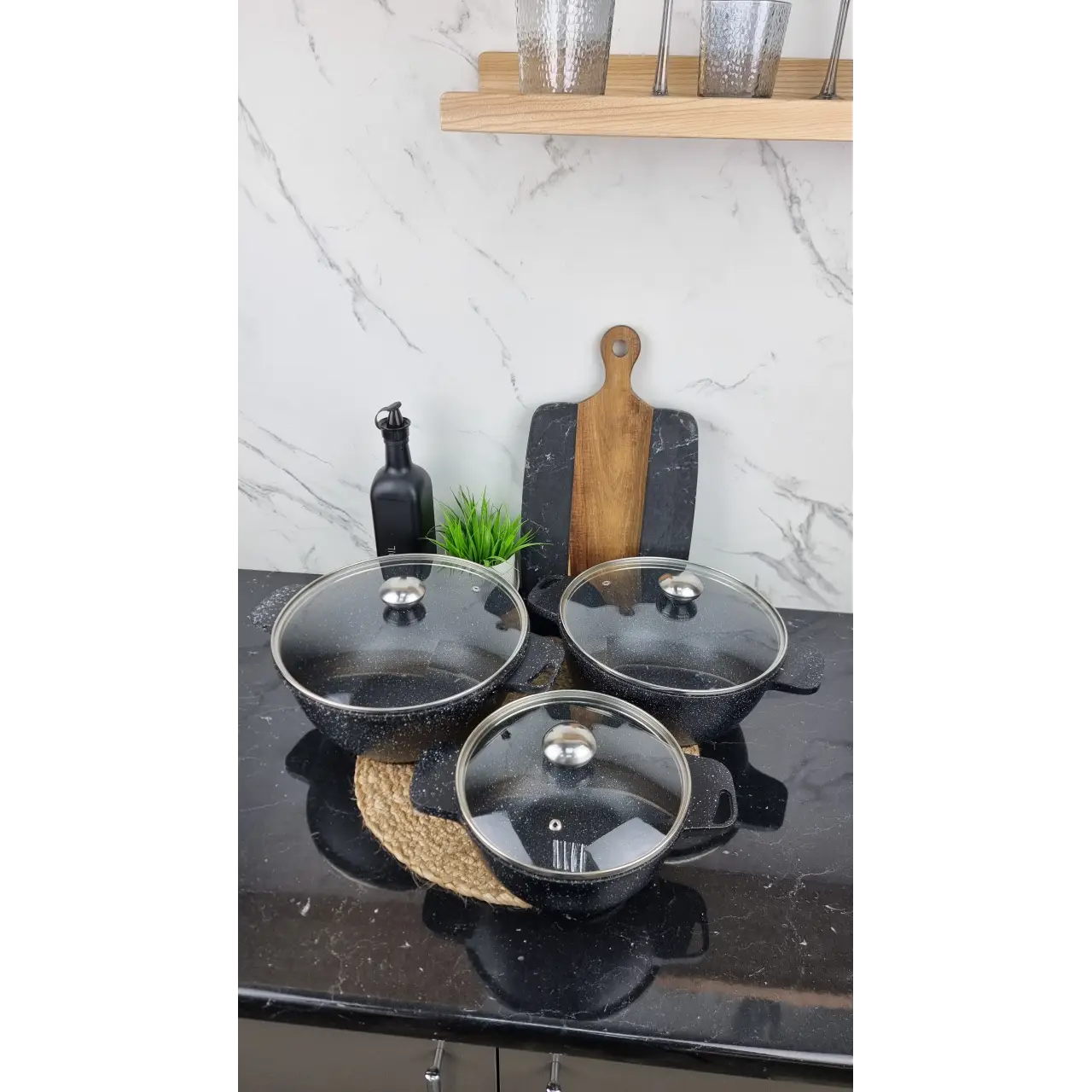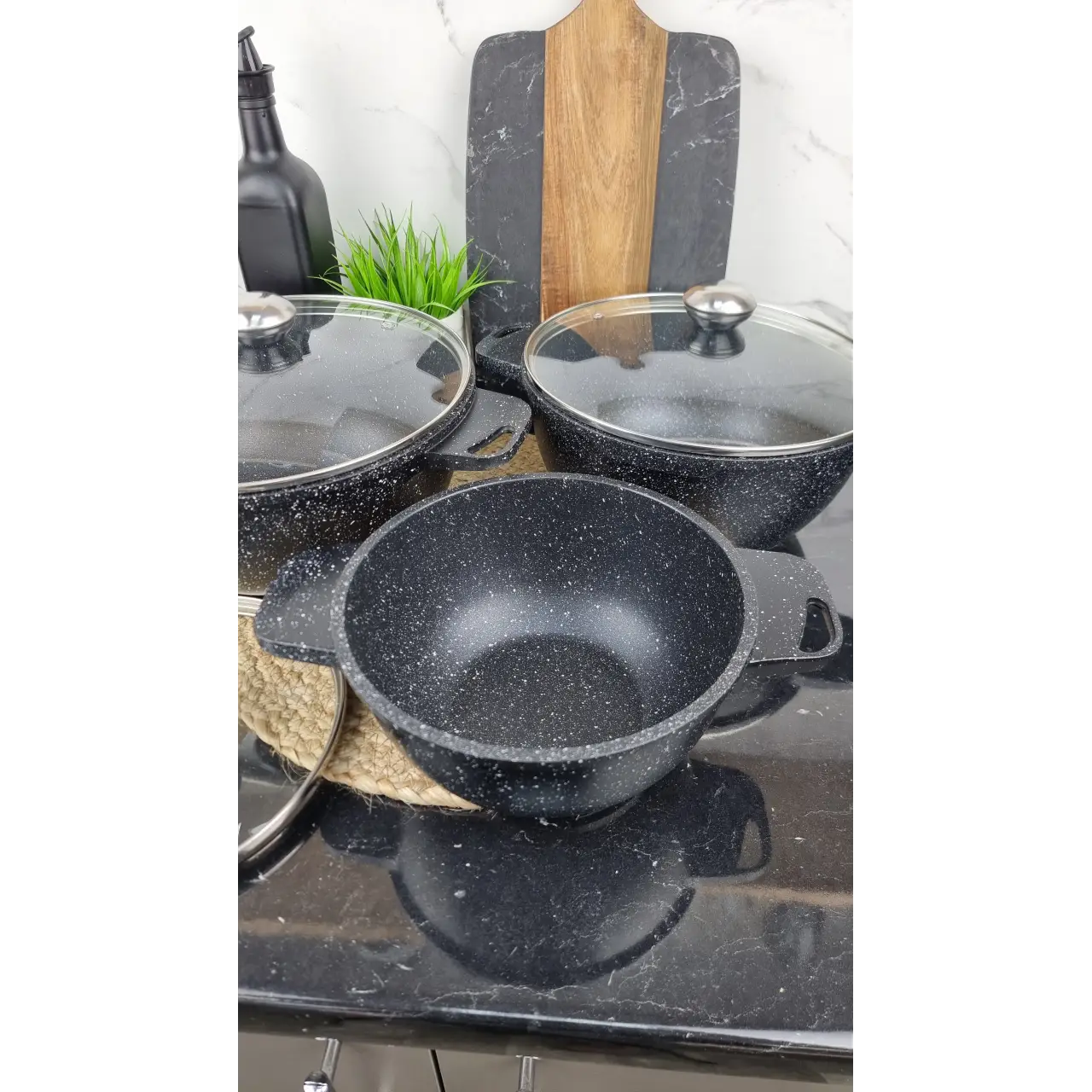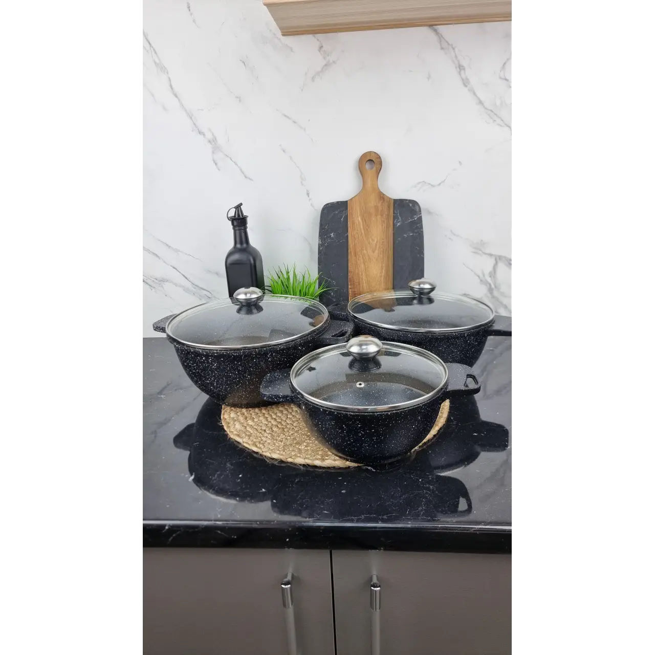 Цей набір каструль з мармуровим покриттям поєднує стильний дизайн та функціональність. В комплект входять каструлі об'ємом 2,4 л, 4,6 л і 5,6 л, які підходять для приготування різноманітних страв. Мармурове антипригарне покриття забезпечує рівномірний прогрів, легке очищення та запобігає прилипання їжі. Каструлі виготовлені з високоякісних матеріалів, що гарантують довговічність і надійність. Посуд підходить для всіх типів плит, включаючи індукційні, і стане чудовим доповненням до будь-якої кухні.