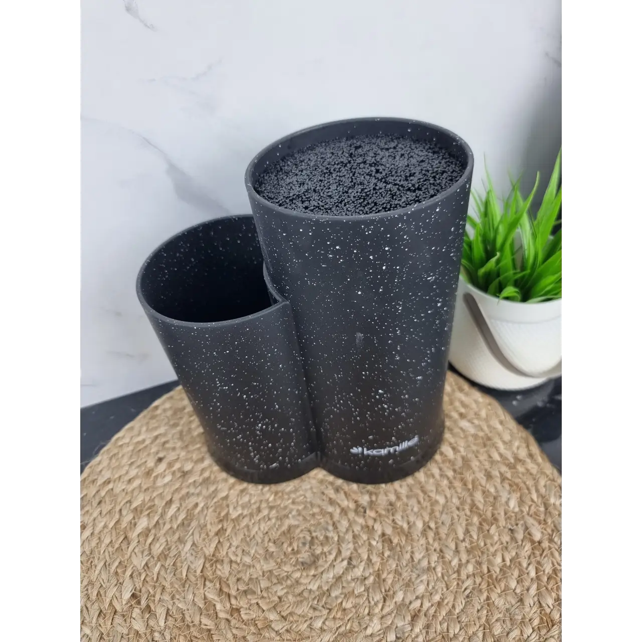 Підставка підходить як для металевих, так і для керамічних ножів, а також для різноманітного кухонного приладдя. Корпус виготовлений із міцного пластику з зовнішнім покриттям soft-touch, приємним на дотик та стійким до забруднень. Сучасний дизайн робить виріб стильним доповненням інтер’єру кухні.