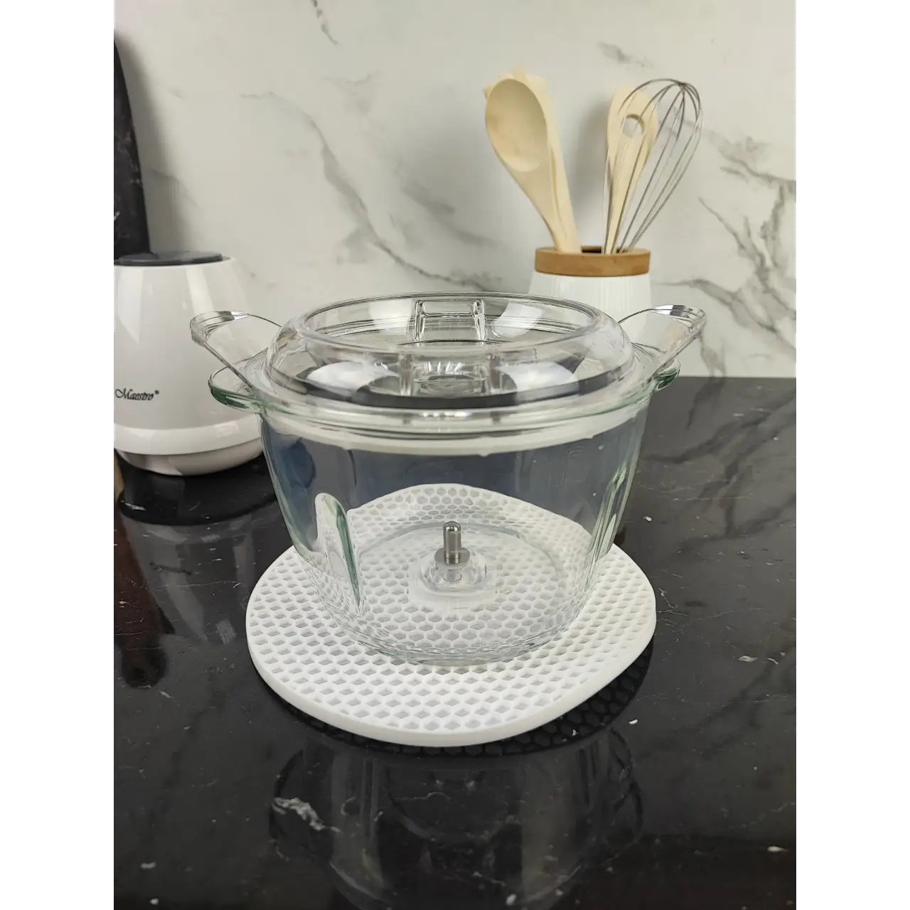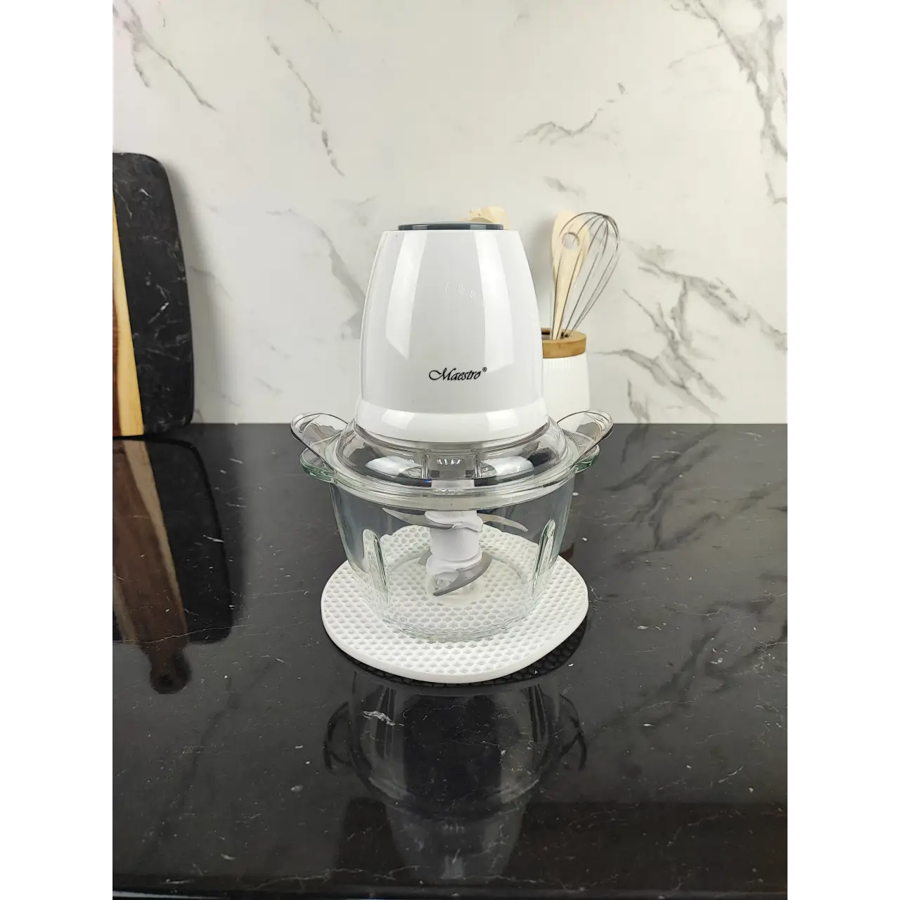 Чопер-прилад призначений для швидкого подрібнення невеликої кількості продукту. Модель Маестро MR-581 має чашу 800 мл. Цього більш ніж достатньо для побутових потреб. Матеріал чаші - скло. Це екологічно, прилад легше миється, оскільки не виникає подряпин, як на пластику, в які потрапляє бруд.