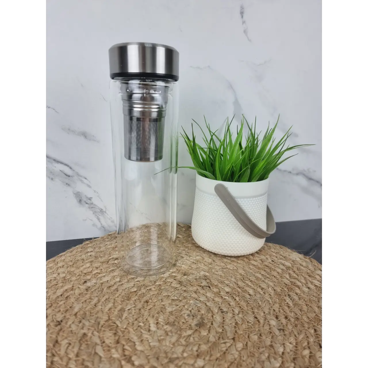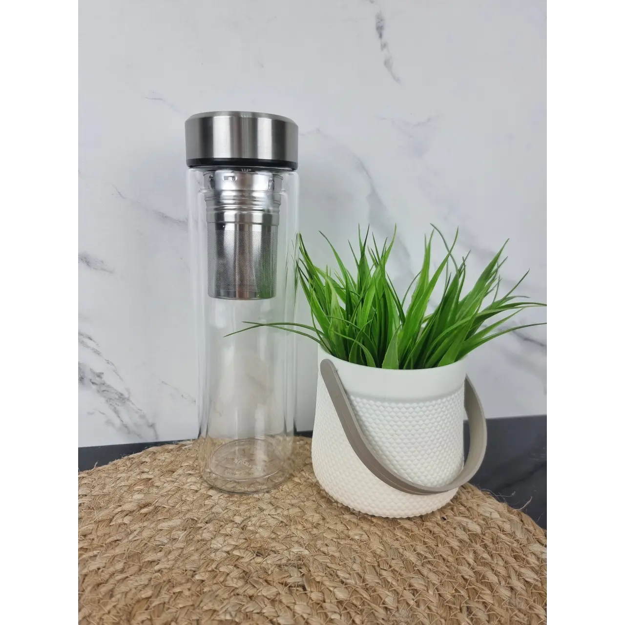 Пляшка із заварником 450мл. Виготовлена з боросилікатного скла найвищої якості. Пляшка з подвійними стінками надзвичайно легка, і водночас набагато міцніша та стійкіша до подряпин і пошкоджень, ніж пляшки з традиційного скла. У ньому можна подавати холодні та гарячі напої. Сталева кришка допомагає підтримувати температуру напою, і вам не доведеться турбуватися про те, що напій проллється під час пиття і перенесення. Легко утримувати в чистоті, можна мити в посудомийній машині (крім кришки і фільтра).