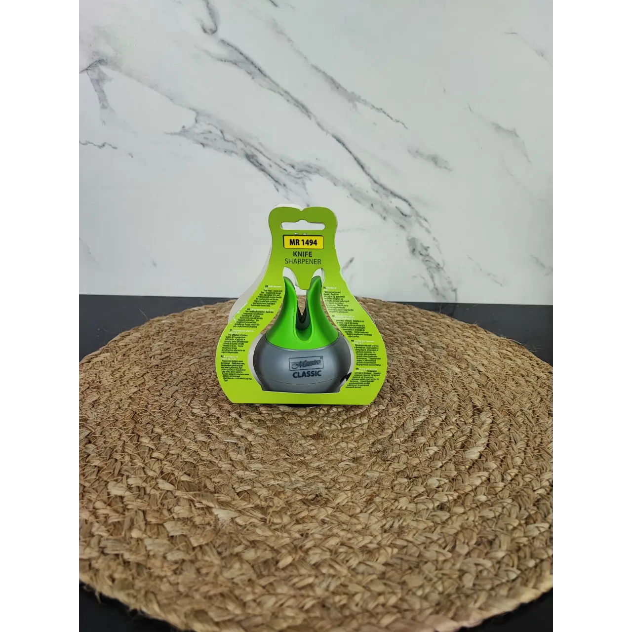 Завдяки не ковзній, гумовій і зручній рукоятці, це точилка для кухонних ножів дуже зручна і безпечна. Ножі вставляються в проріз цієї яскравої "цибулини". Нижній важіль перемикає режими заточування. Груба або більш ніжна. Точилка компактніша і менша за свої аналоги. Кольори поєднуються із силіконовими аксесуарами від Маестро. Можна сміливо додавати в райдужну колекцію